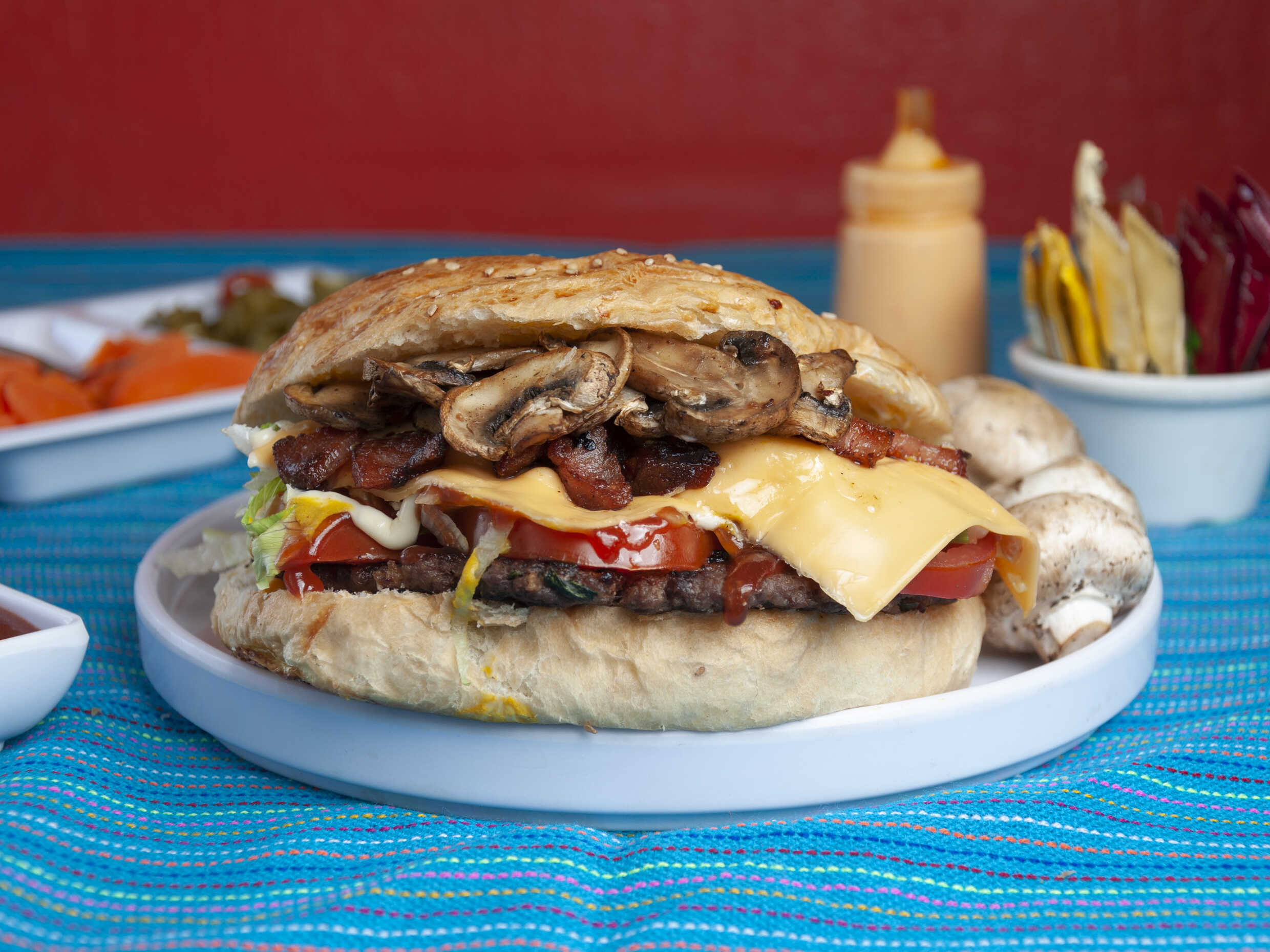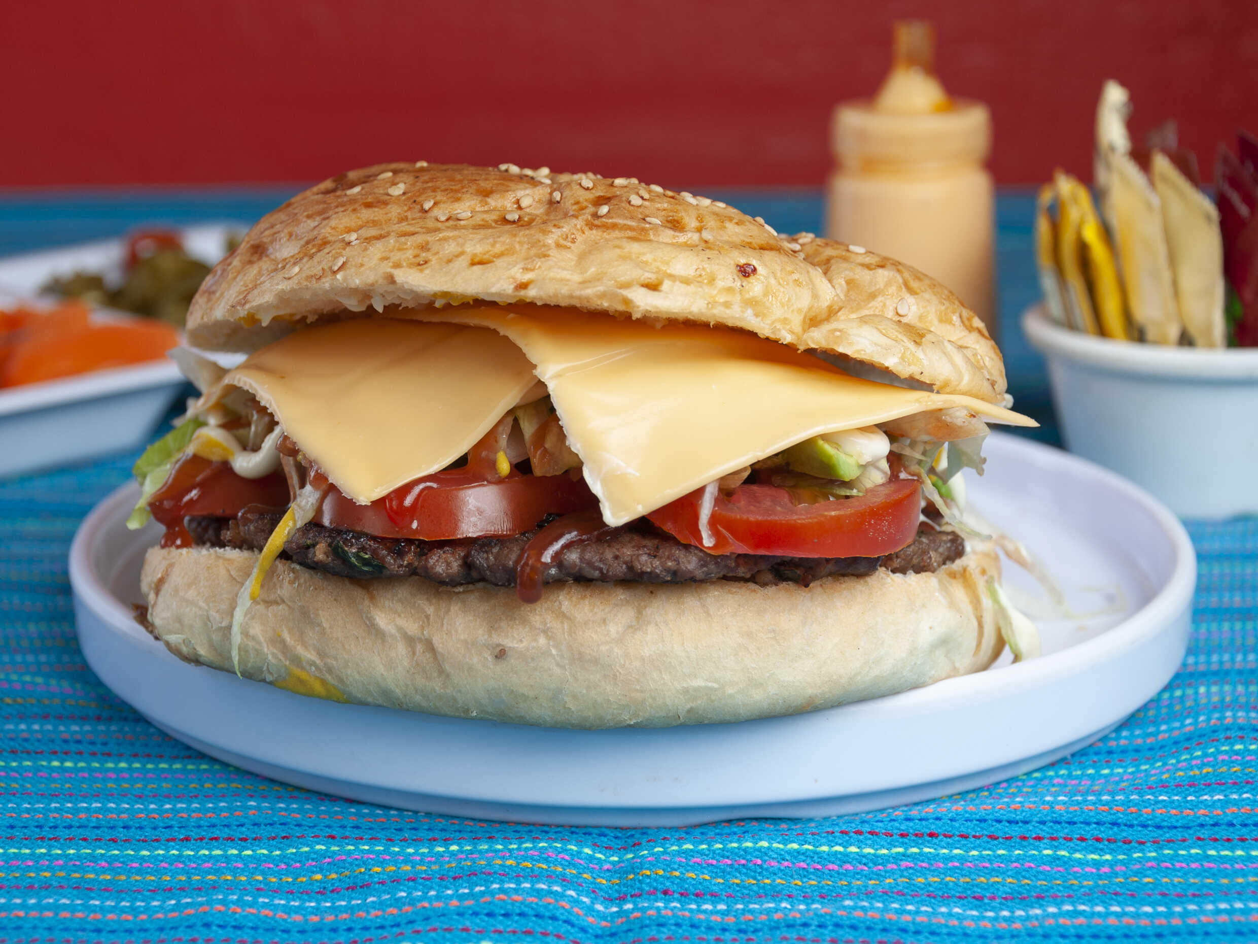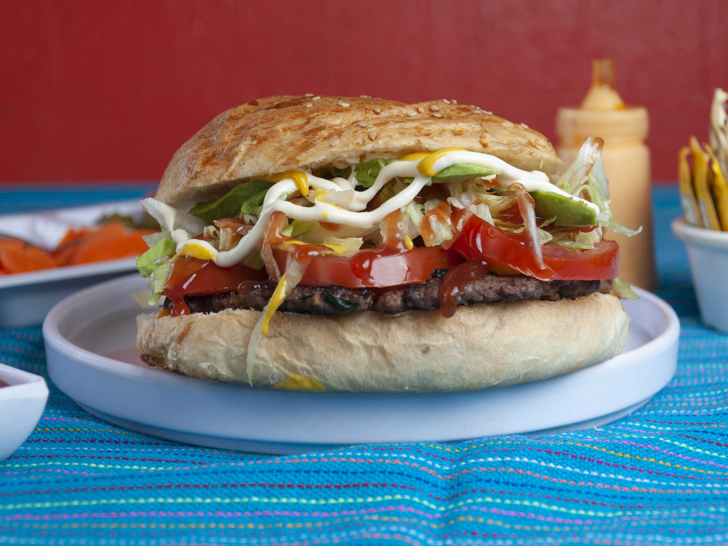 Carne de res, jitomate, lechuga, aguacate, catsup, mayonesa y mostaza.
