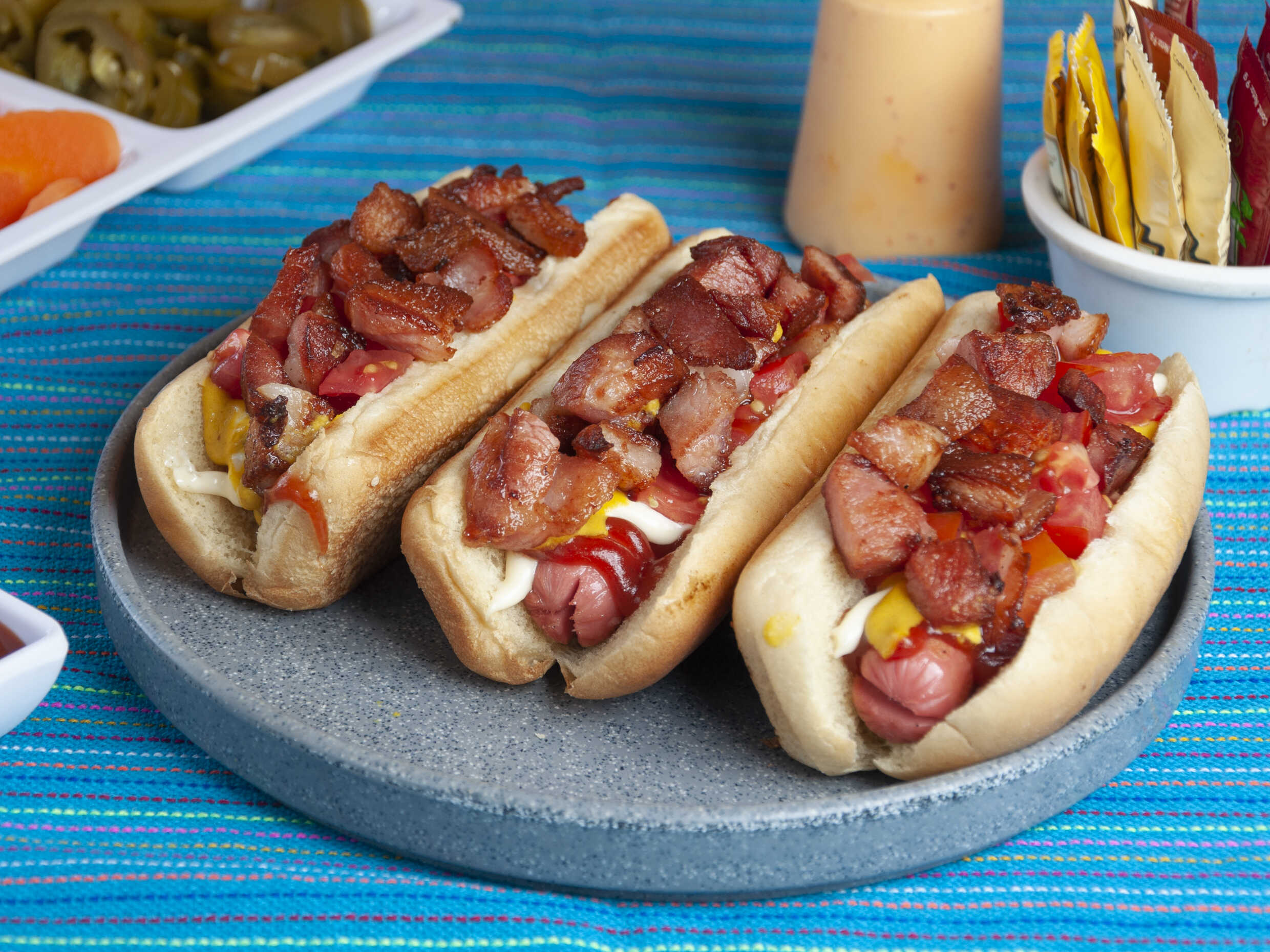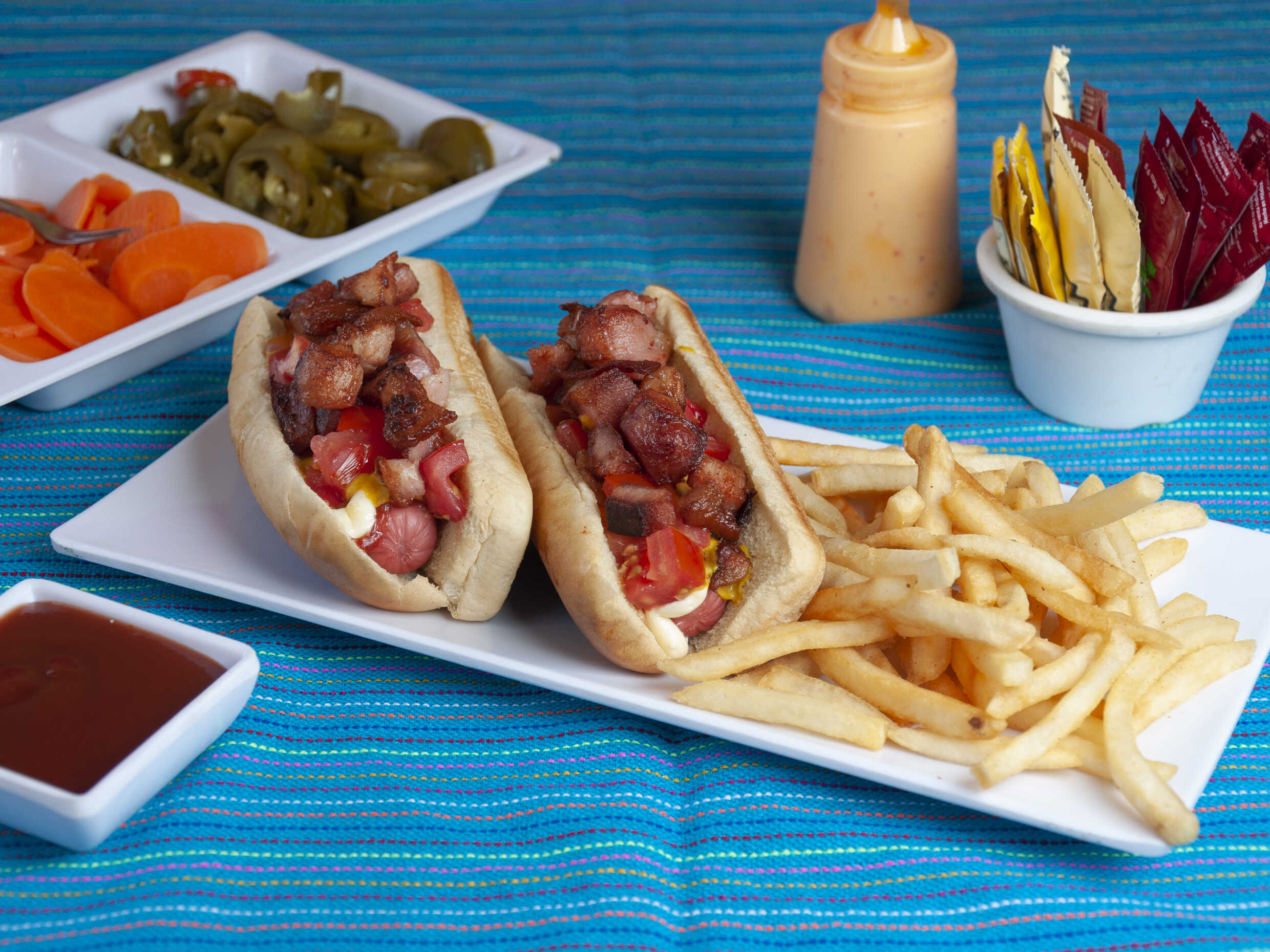 Doble salchicha, tocino, jitomate, catsup, mayonesa y mostaza.