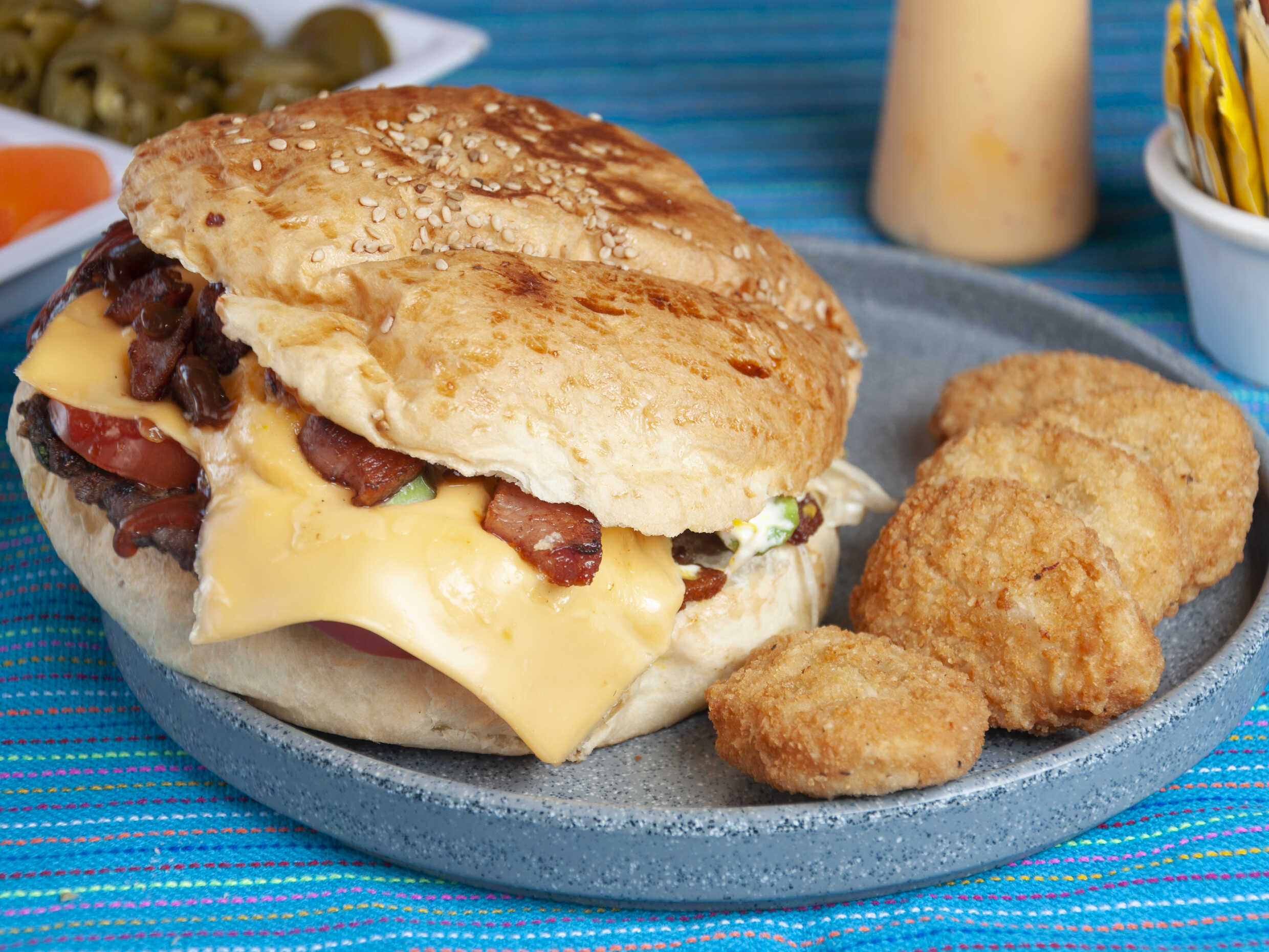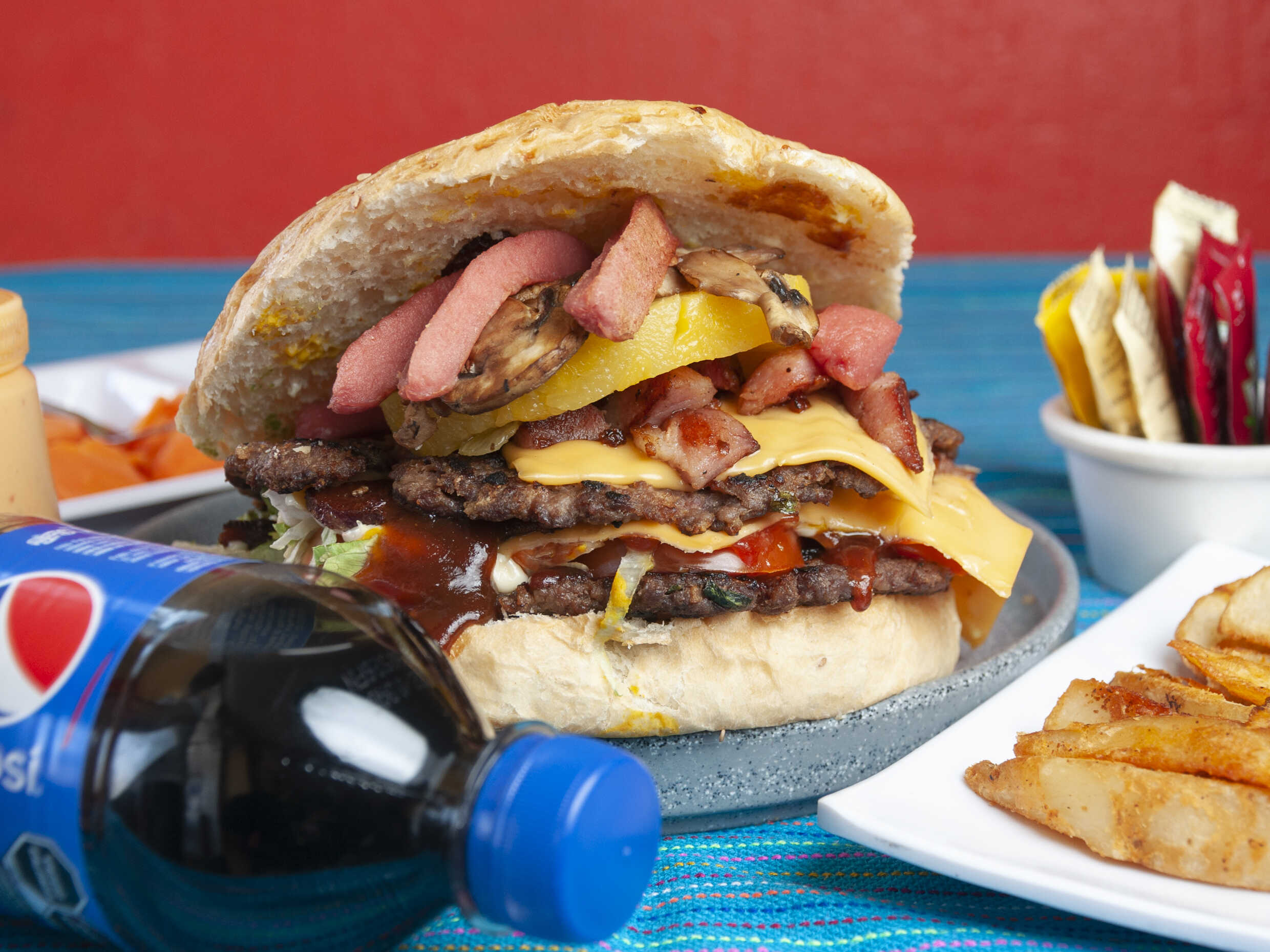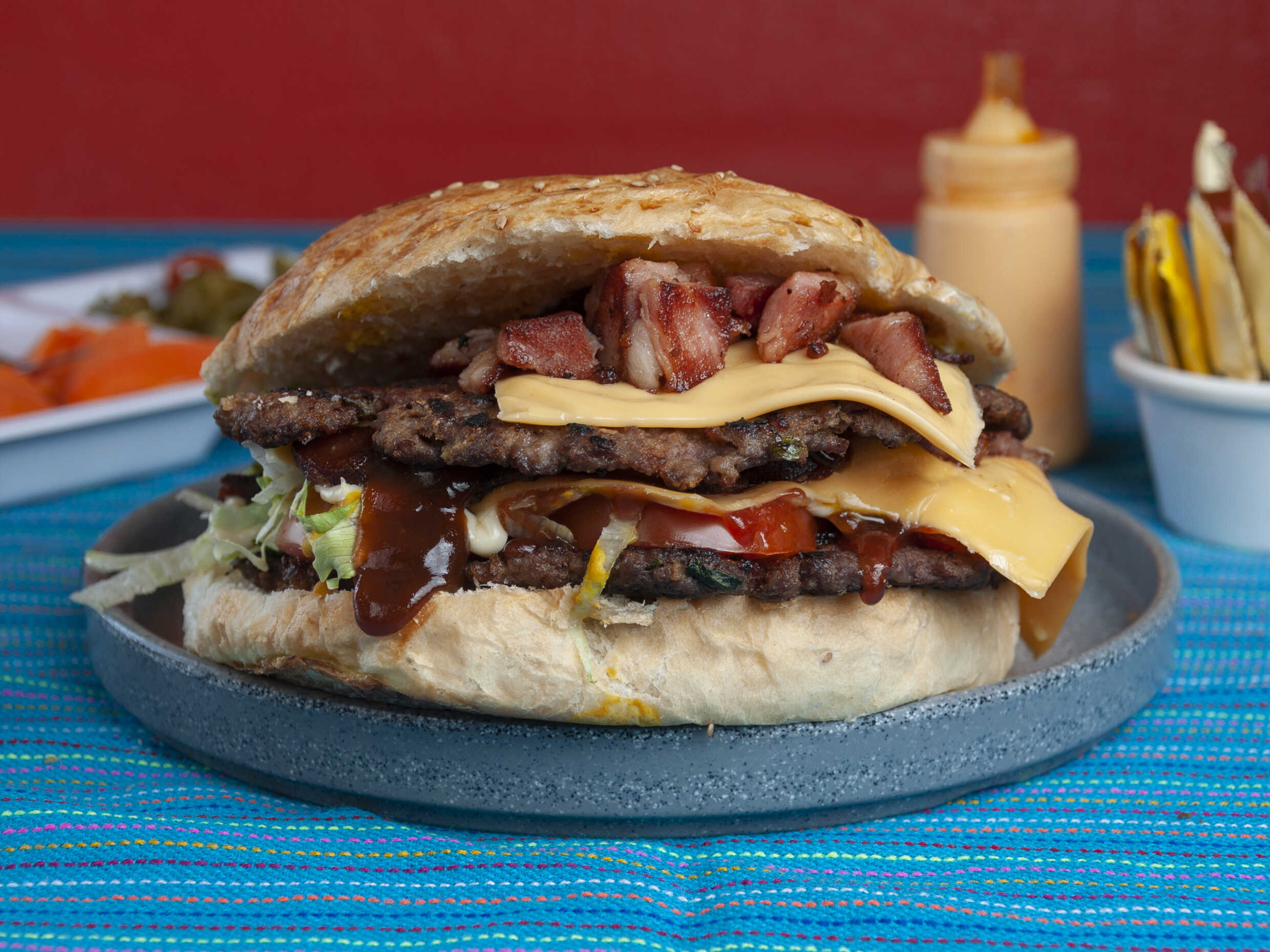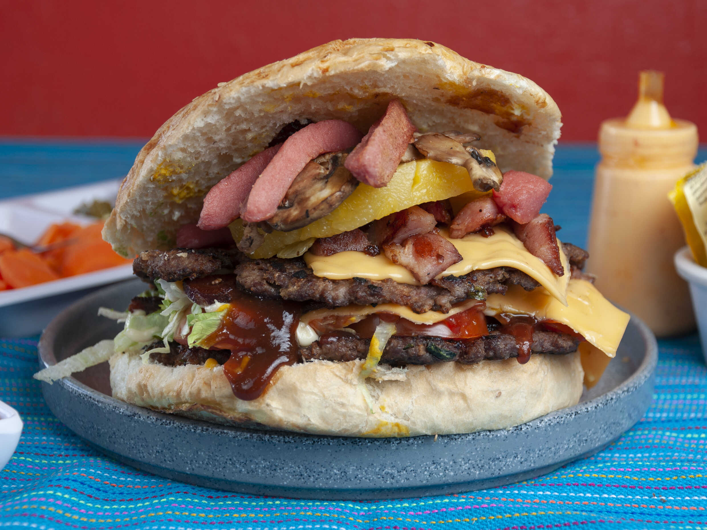 Doble carne de res, doble queso amarillo, doble tocino, jamón, jitomate, lechuga, aguacate, catsup, mayonesa y mostaza.