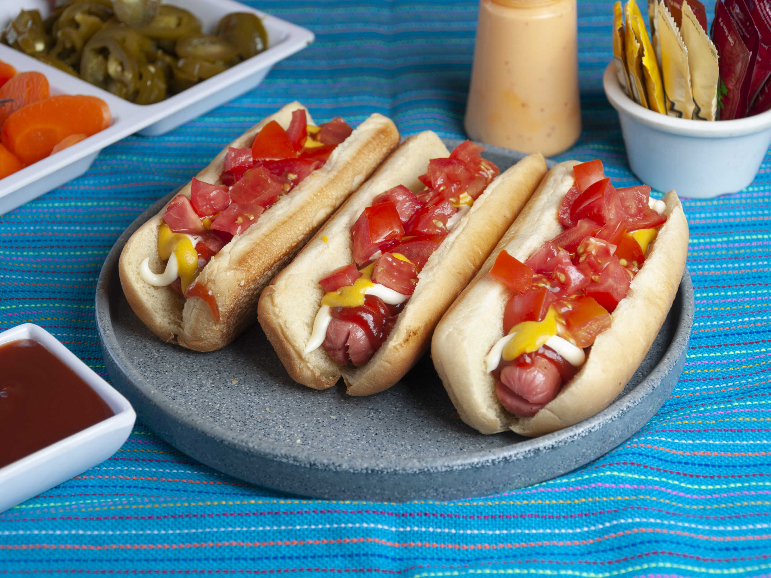 Salchicha, jitomate, catsup, mayonesa y mostaza.
