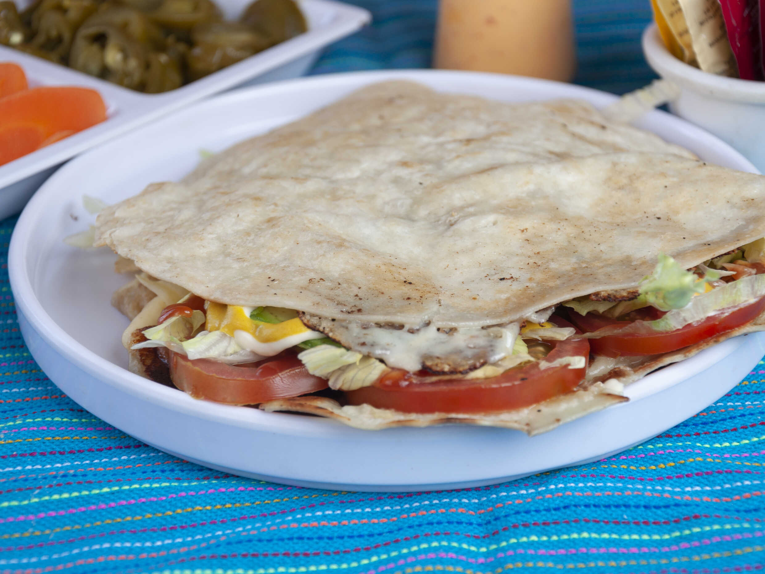 Queso asadero, jamón, jitomate, lechuga, aguacate, catsup, mayonesa y mostaza.