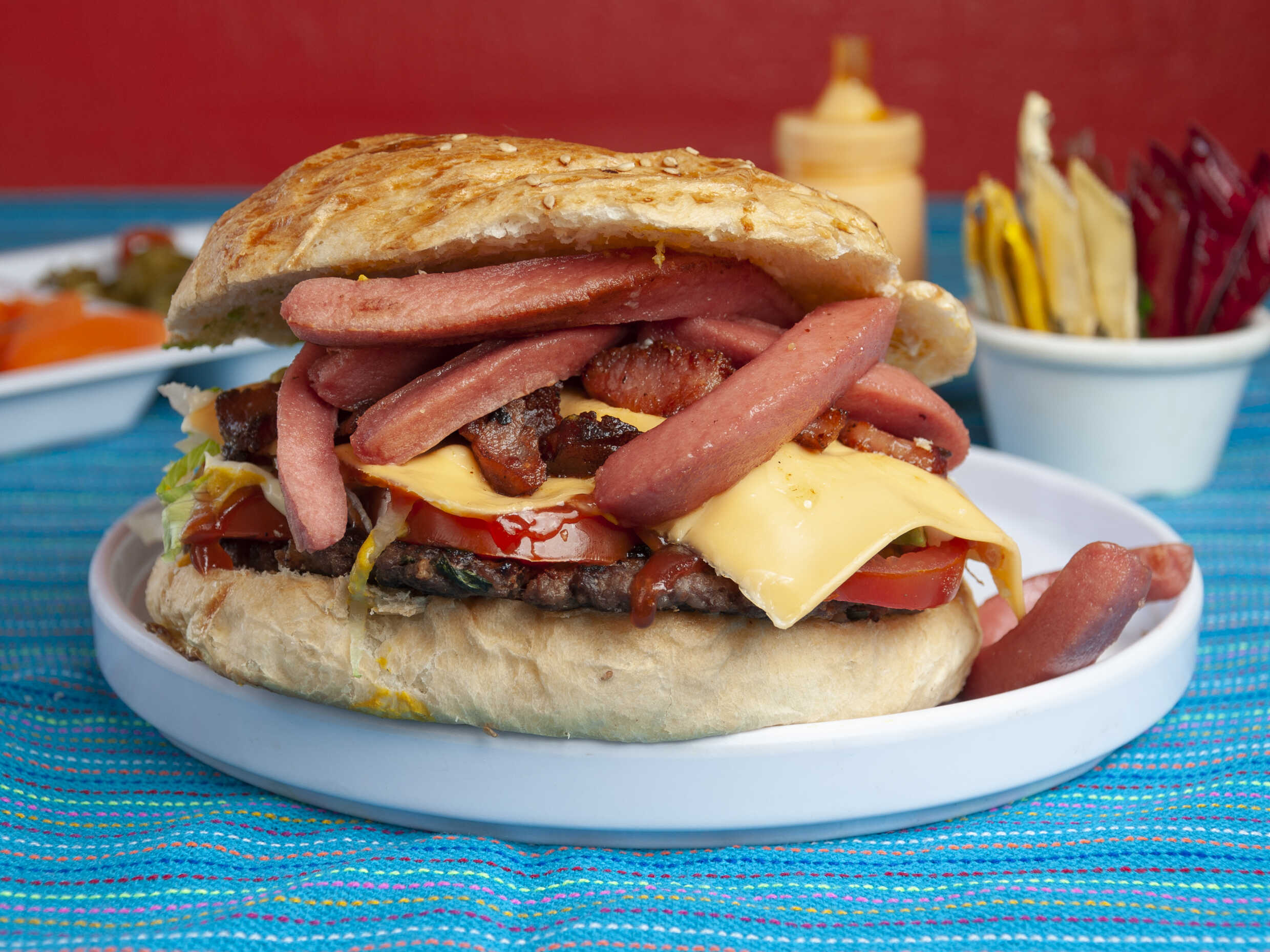 Doble carne de res, doble queso amarillo, doble tocino, jamón, piña, champiñon, salchicha, jitomate, lechuga, aguacate, catsup, mayonesa y mostaza.