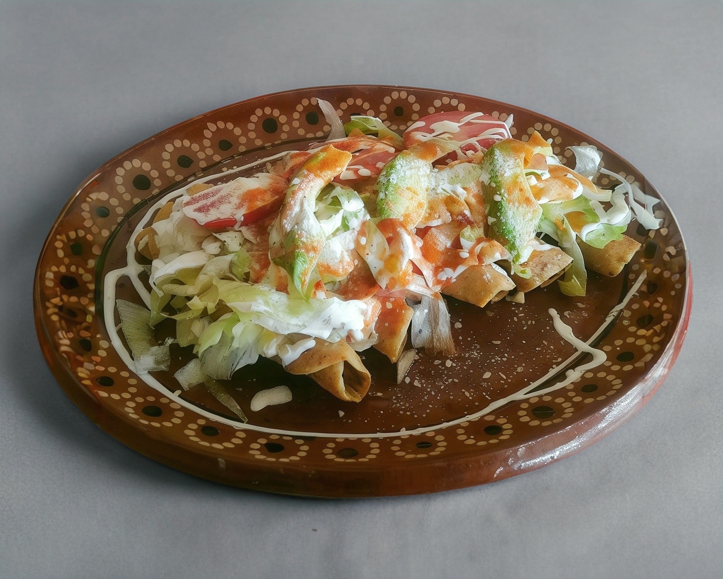 Deliciosas flautas rellenas de pollo, acompañadas con lechuga, crema, queso y cebolla.