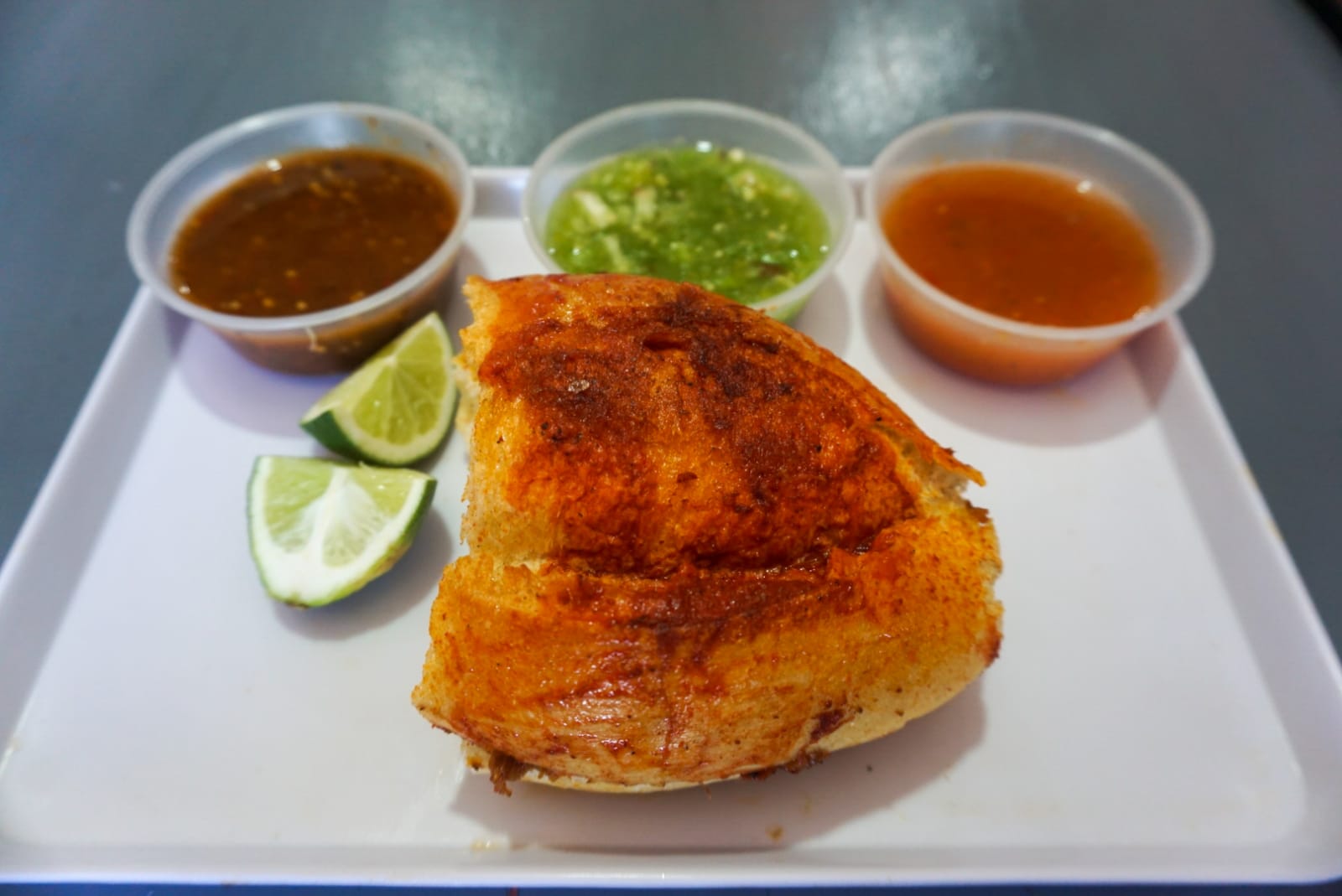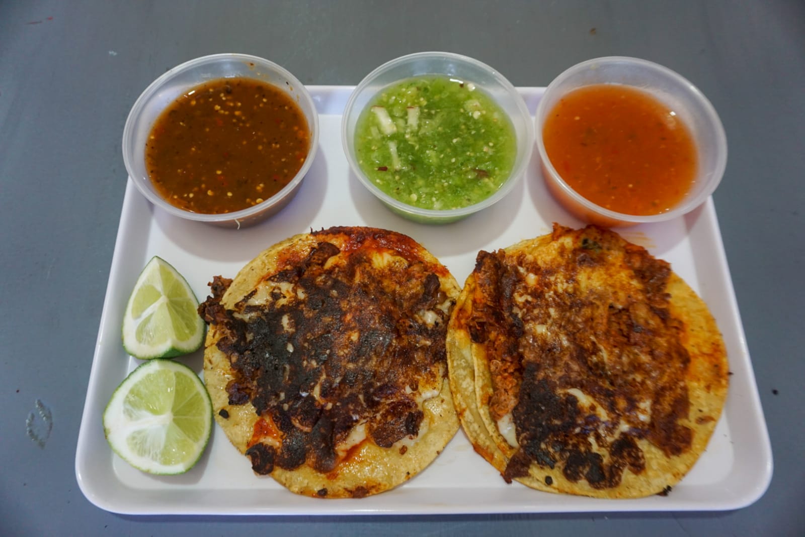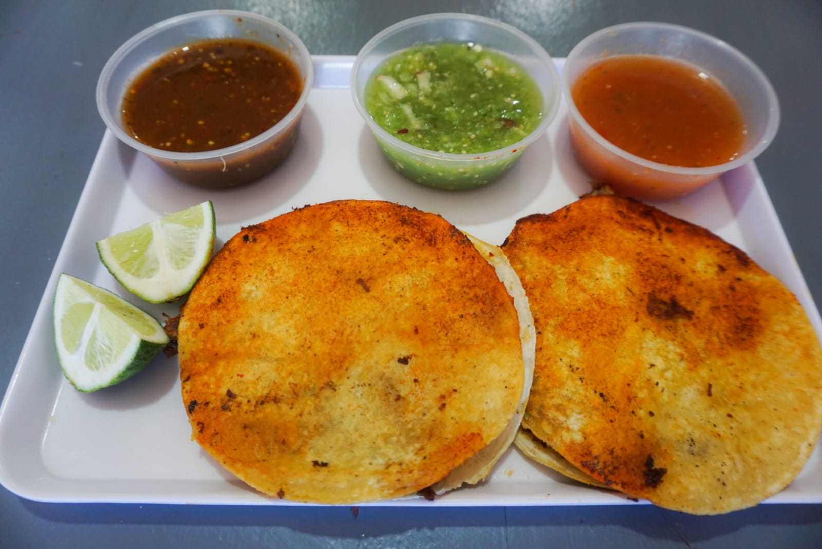 quesadilla de maiz en doble tortilla, rellena de barbacoa