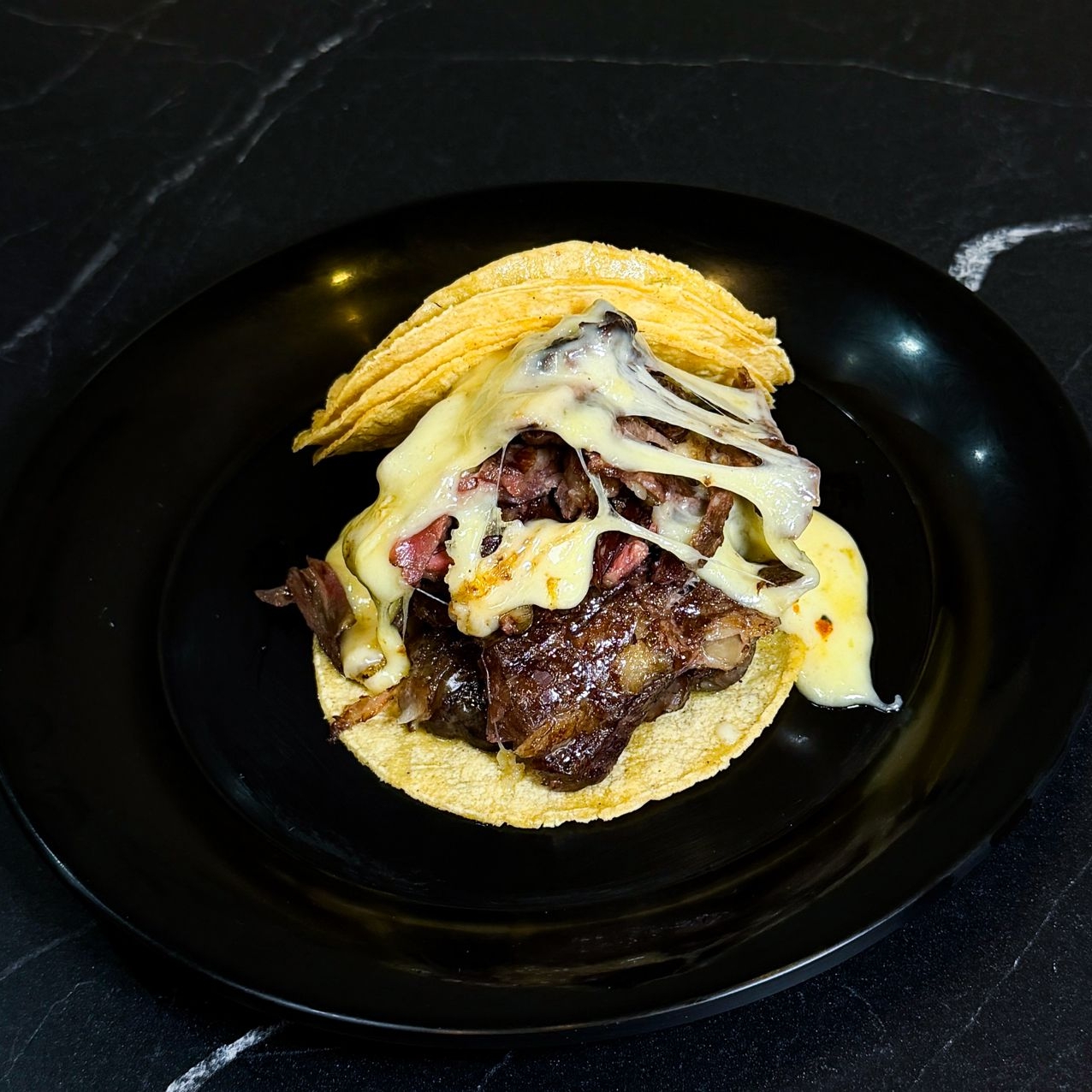 Quesadilla con mezcla de sirloin y pastor en tortilla de maíz.