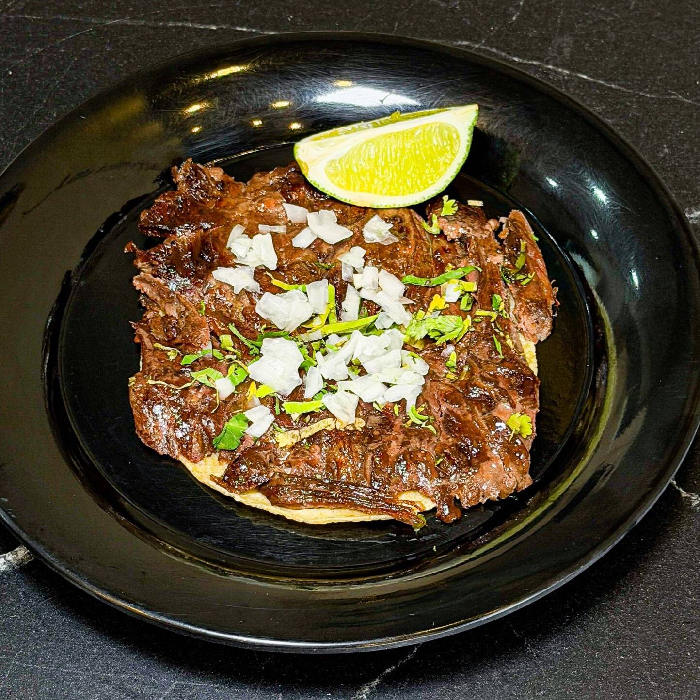 Taco individual de sirloin de alta calidad servido en tortilla de maíz artesanal.