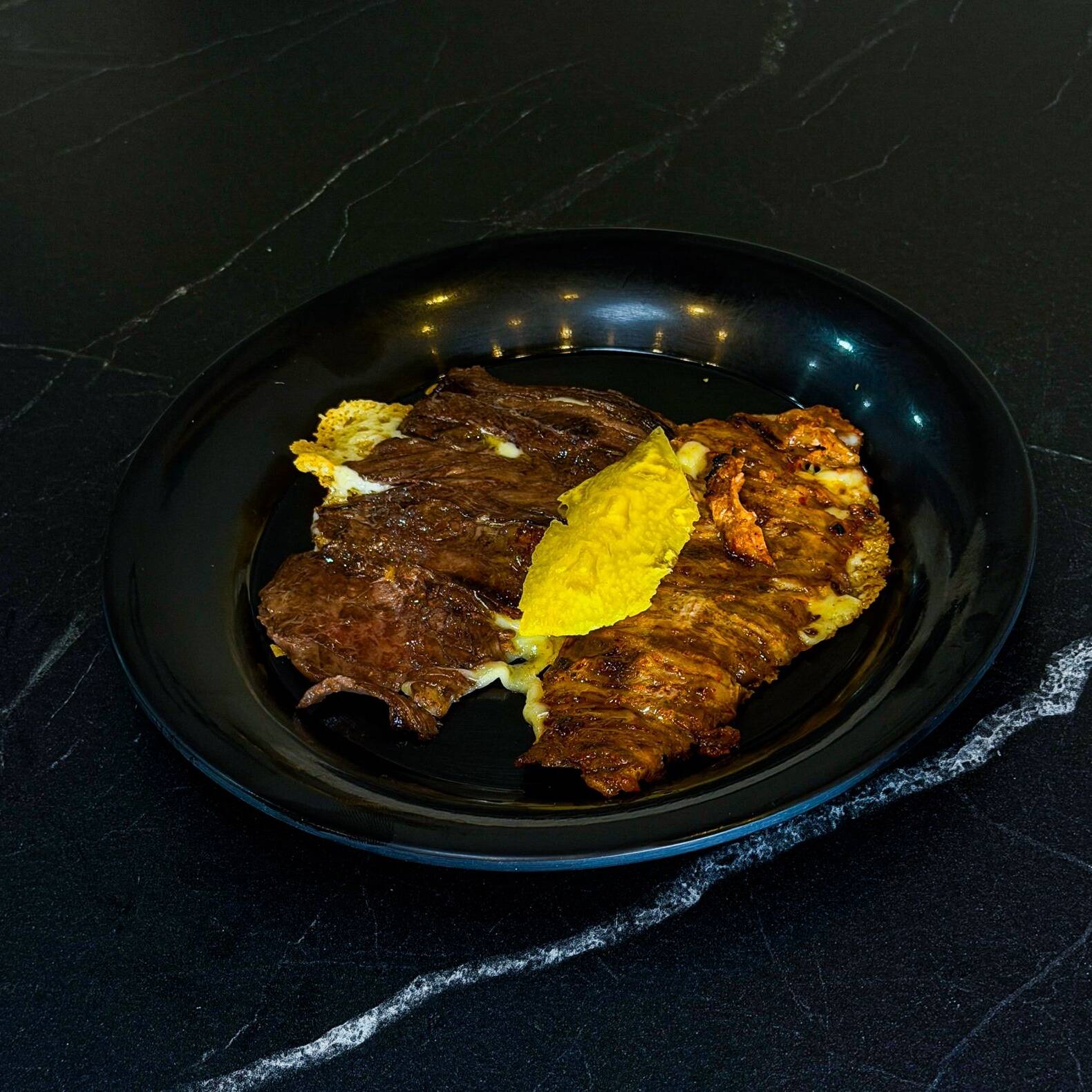 Queso fundido premium acompañado de finos cortes de sirloin.