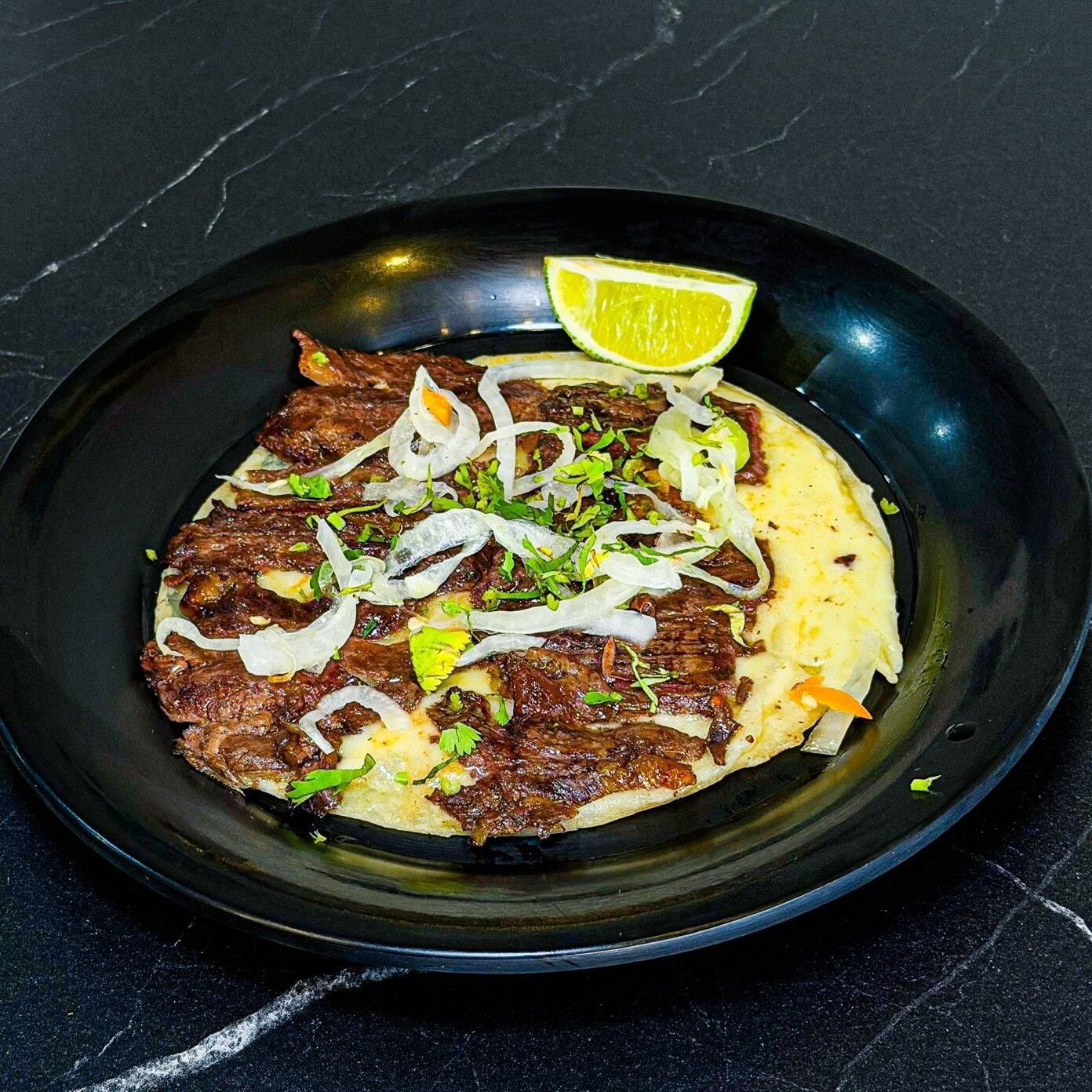 Especialidad de la casa con una porción generosa de sirloin en tortilla de maíz.