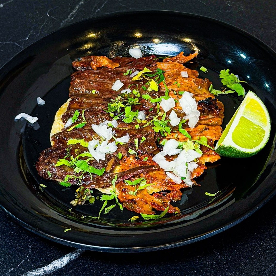 Mezcla de sirloin y pastor servido en tortilla de maíz.