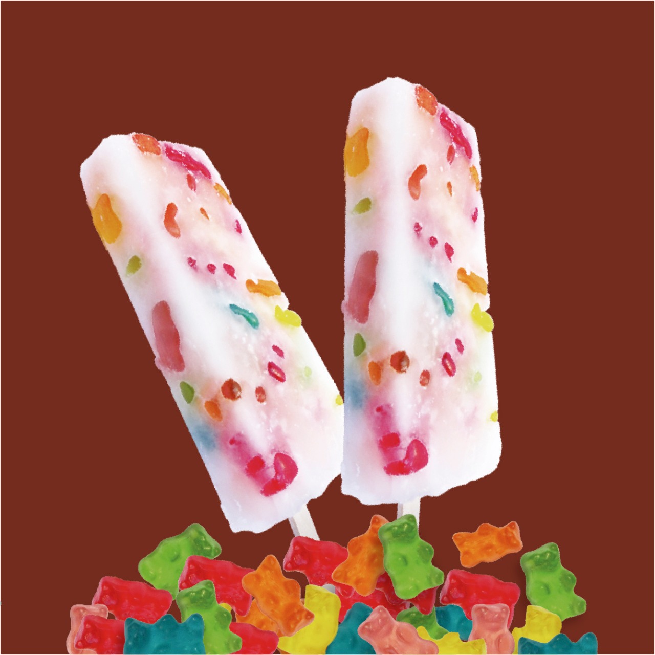 Deliciosa paleta de leche bicolor sabor a algodón de azúcar y una gomita de colores.
