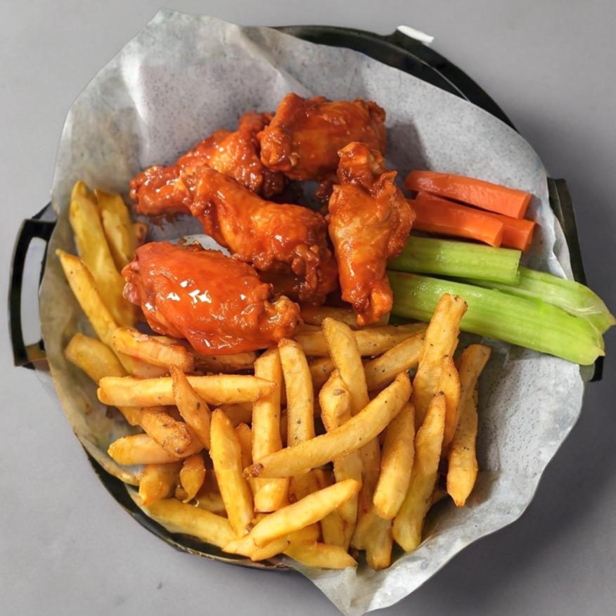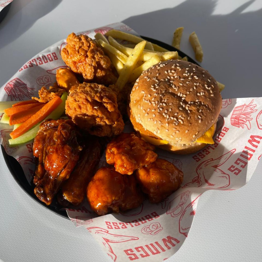 3 Haburguesas de Pollo + 500 gr. de Boneless + 20 Piezas de Alitas + 400 gr. de Papas a la Francesa + 5 aros de cebolla