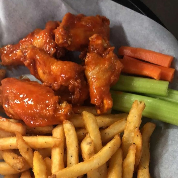Acompañados de vegetales, papas a la francesa, aros de cebolla y ranch.
