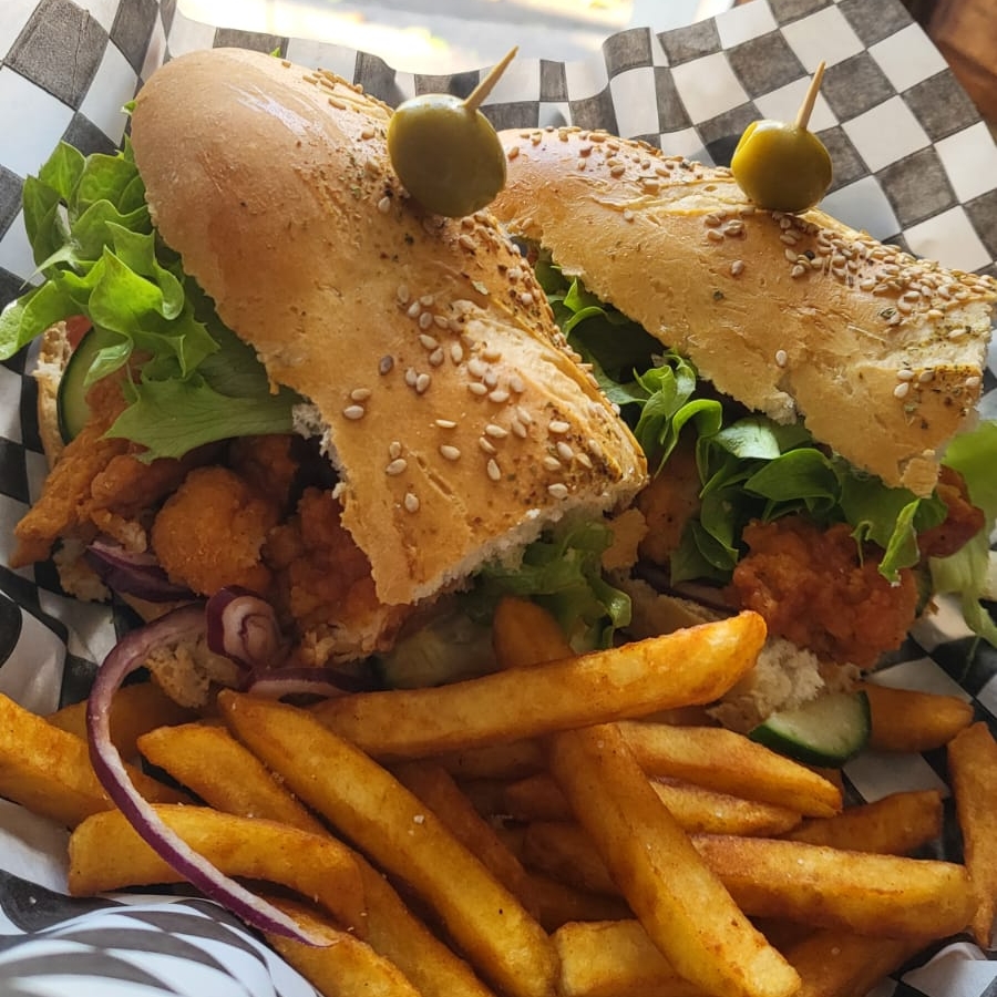 Pan artesanal con tocino, lechuga, jitomate, aguacate, aros de cebolla, pepino, y chiles. Salsa bbq. Acompañado de papas a la francesa