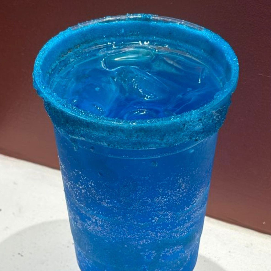 refrescante y divertida bebida con soda citrica, jarabe de mora azul, jugo de limon natural, agua mineral y deliciosas gomitas de mora azul