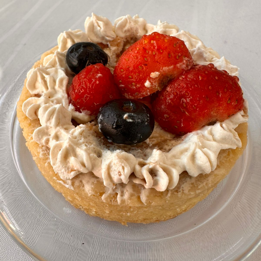 deliciosa mini tarta con pera fresca recien horneada, puede ir coronada con crema y fruta de tu preferencia