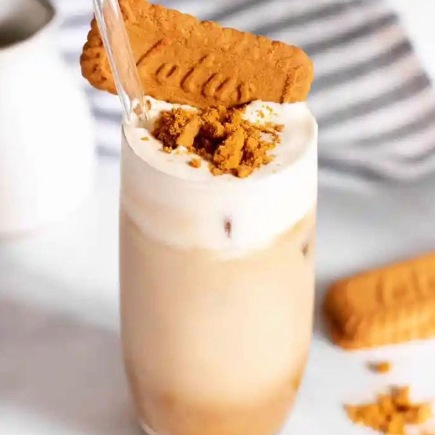 Delicioso latte frio con crema de lotus y galleta lotus encima