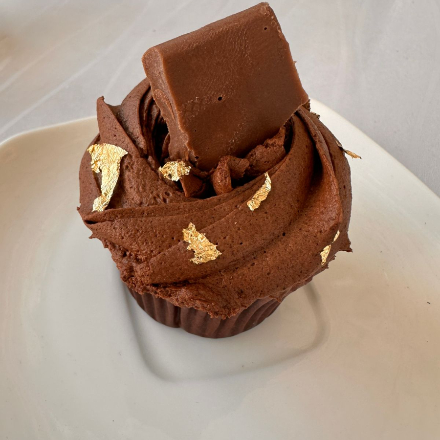 Delicioso cupcake recien horneado de chocolate Hersheys con frosting de chocolate (decoracion variable)