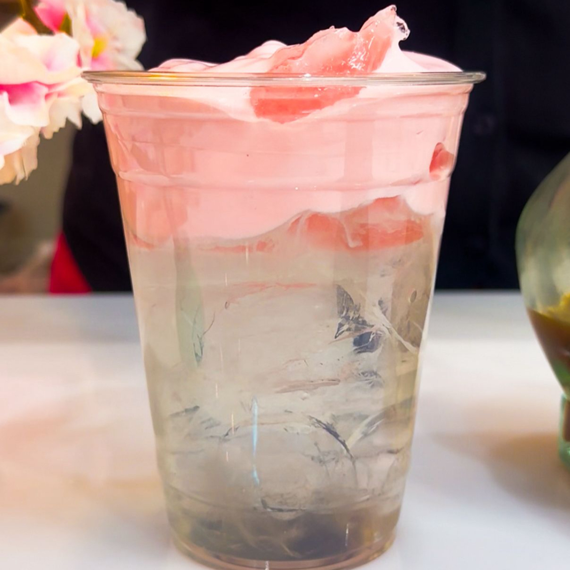 Agua de coco pura y helada como base, rematada con un golpe dulce de crema batida de fresa