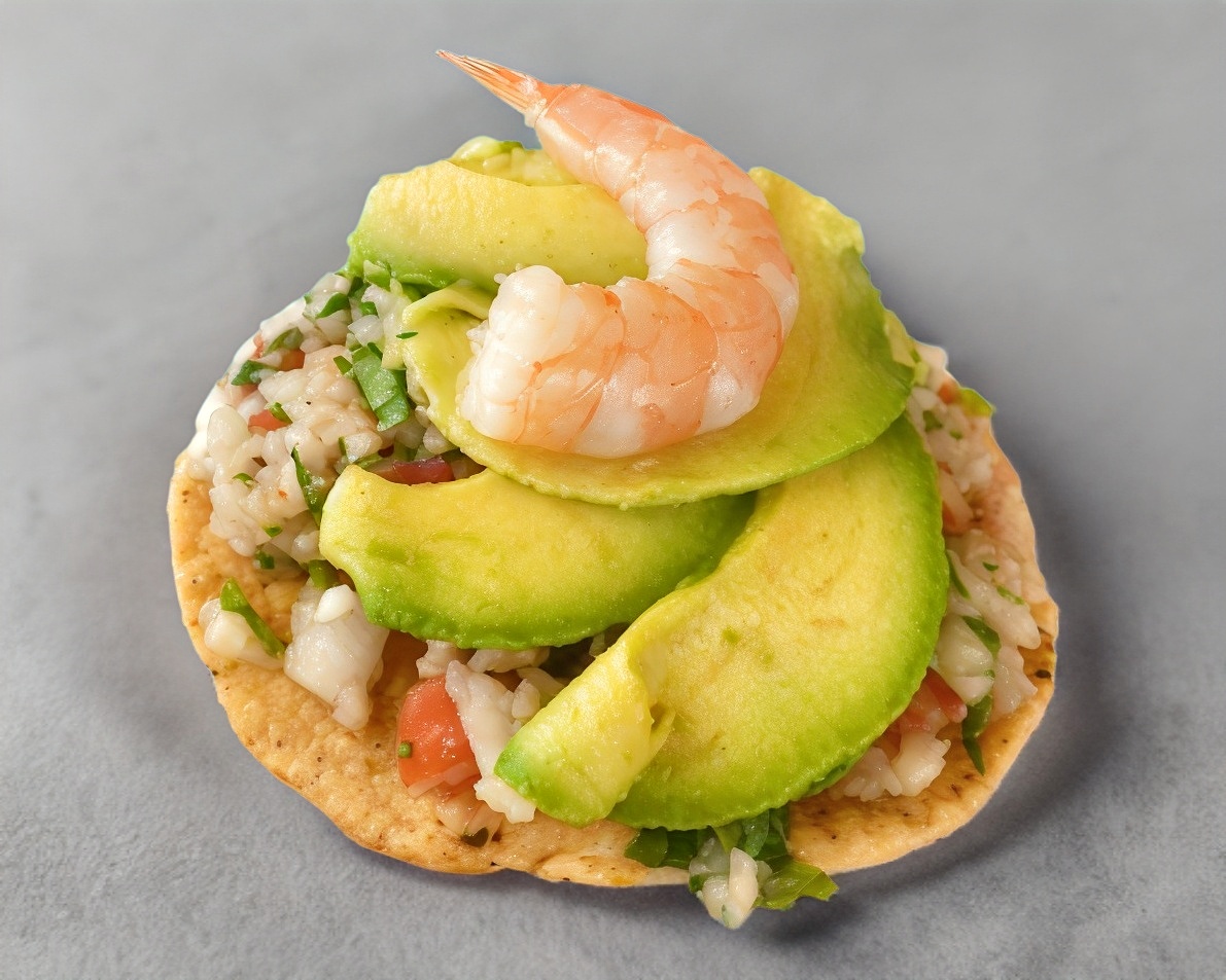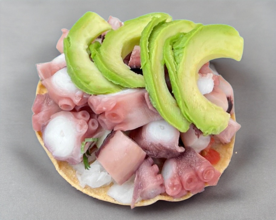 Una combinación increibe, prueba los tostitos con camarón, pulpo fresco, y un poco de verdura.