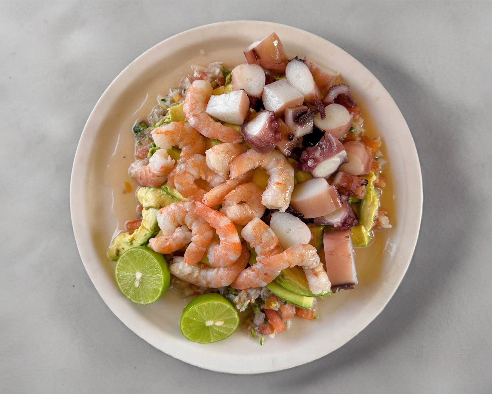 Lo más fresco del mar en un solo plato, nuestro delicioso ceviche de pescado con pulpo, y camarónes frescos. Incluye tostadas, salsa y limón.