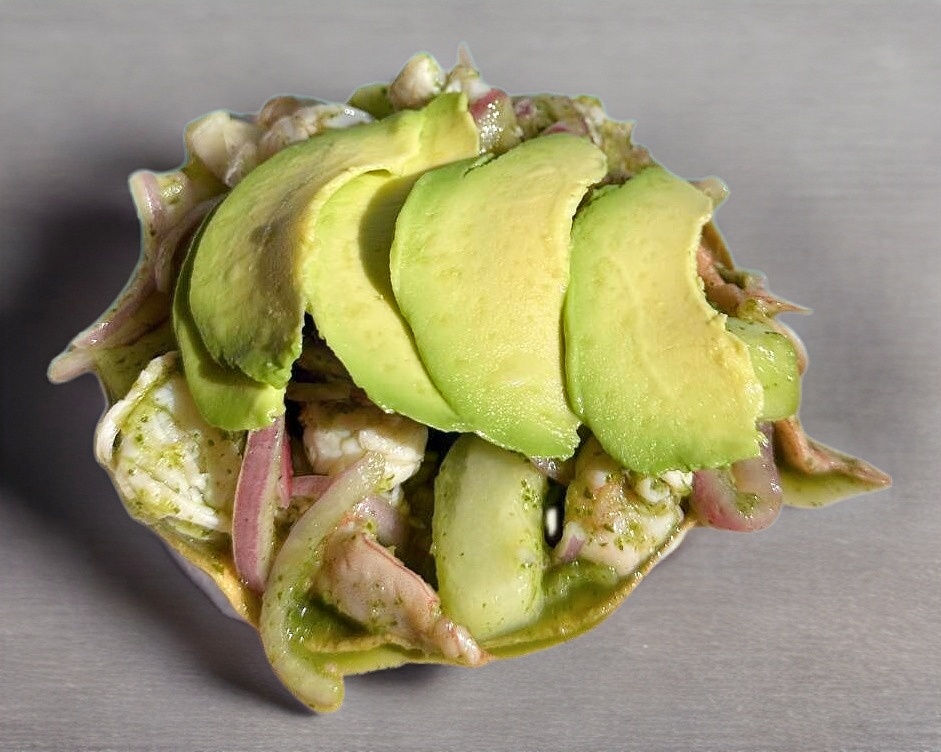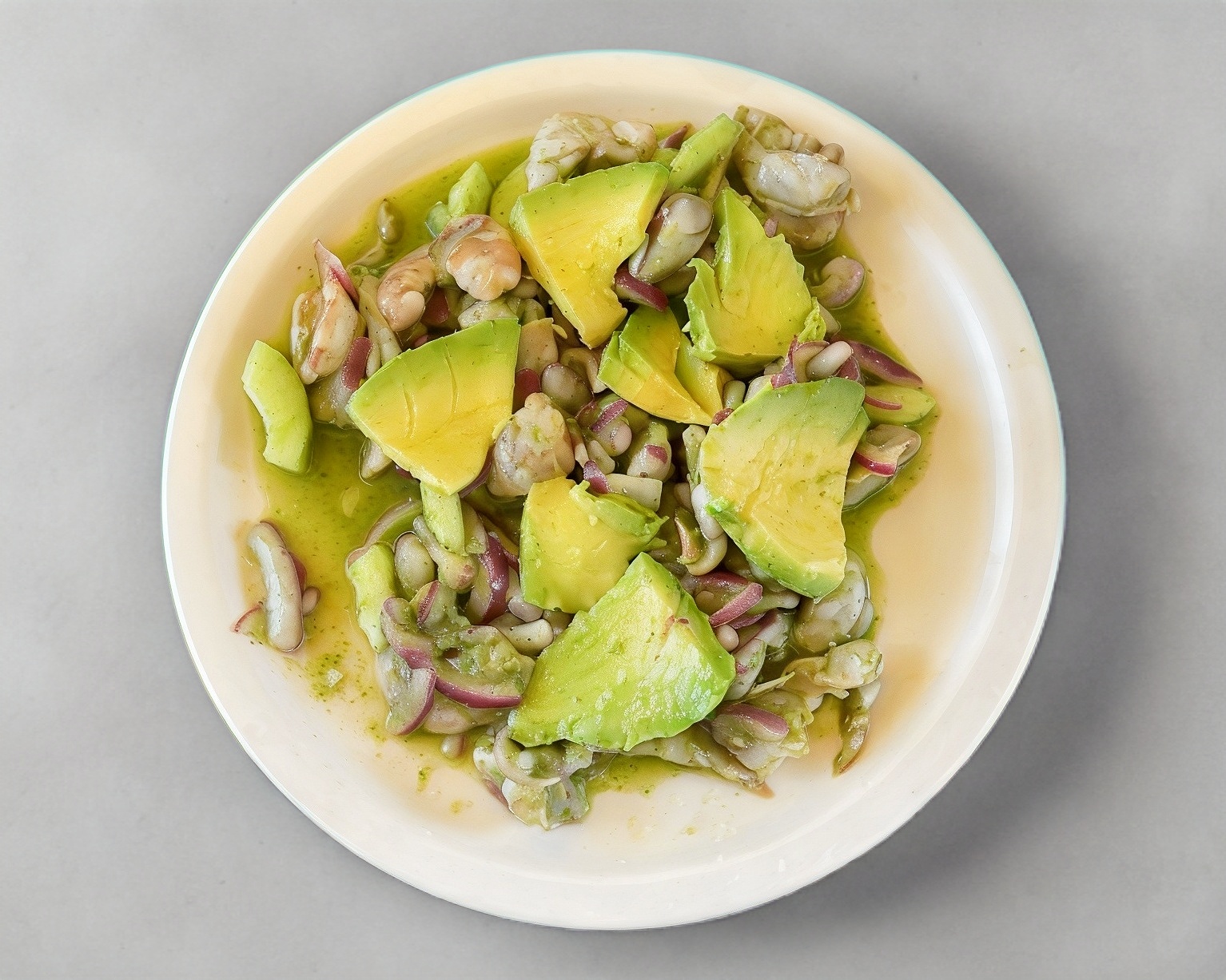 Variedad de frescos y grandes mariscos, acompañados de aguacate, jitomate, cebolla, cilantro y jugo de limón con caldo frio de camarón. Incluye galletas y salsa.