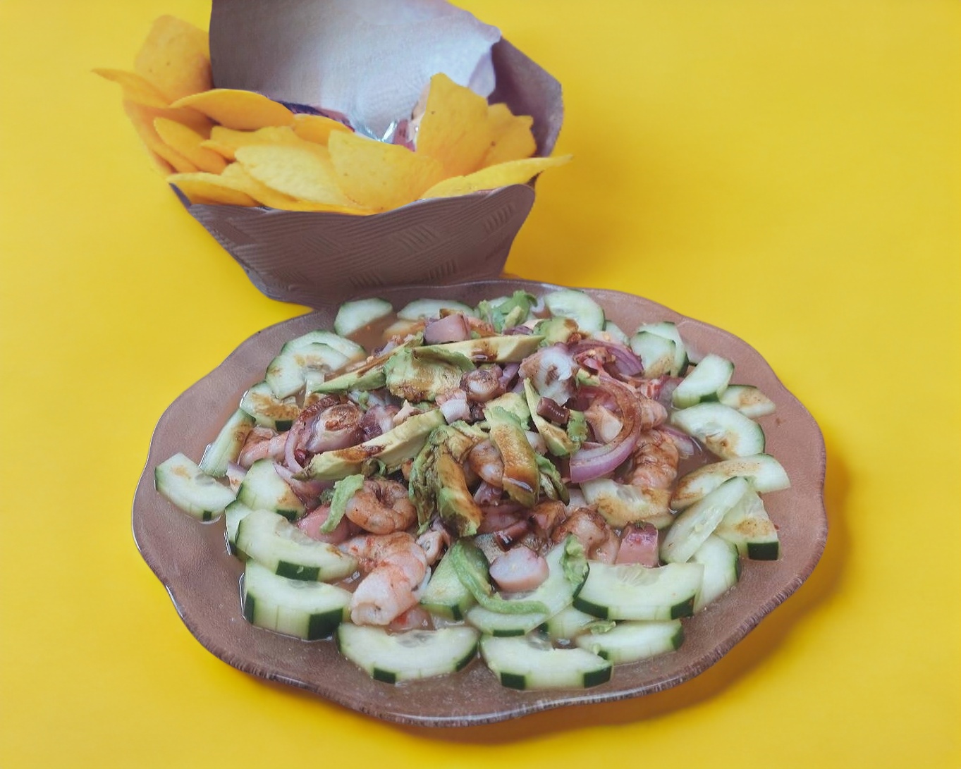 Camaron crudo, camaron precocido, pulpo, calamar, ostion, callo de almeja, curtidos en limón, cebolla morada, pepino, aguacate, bañada en salsa chiltepin y tostadas