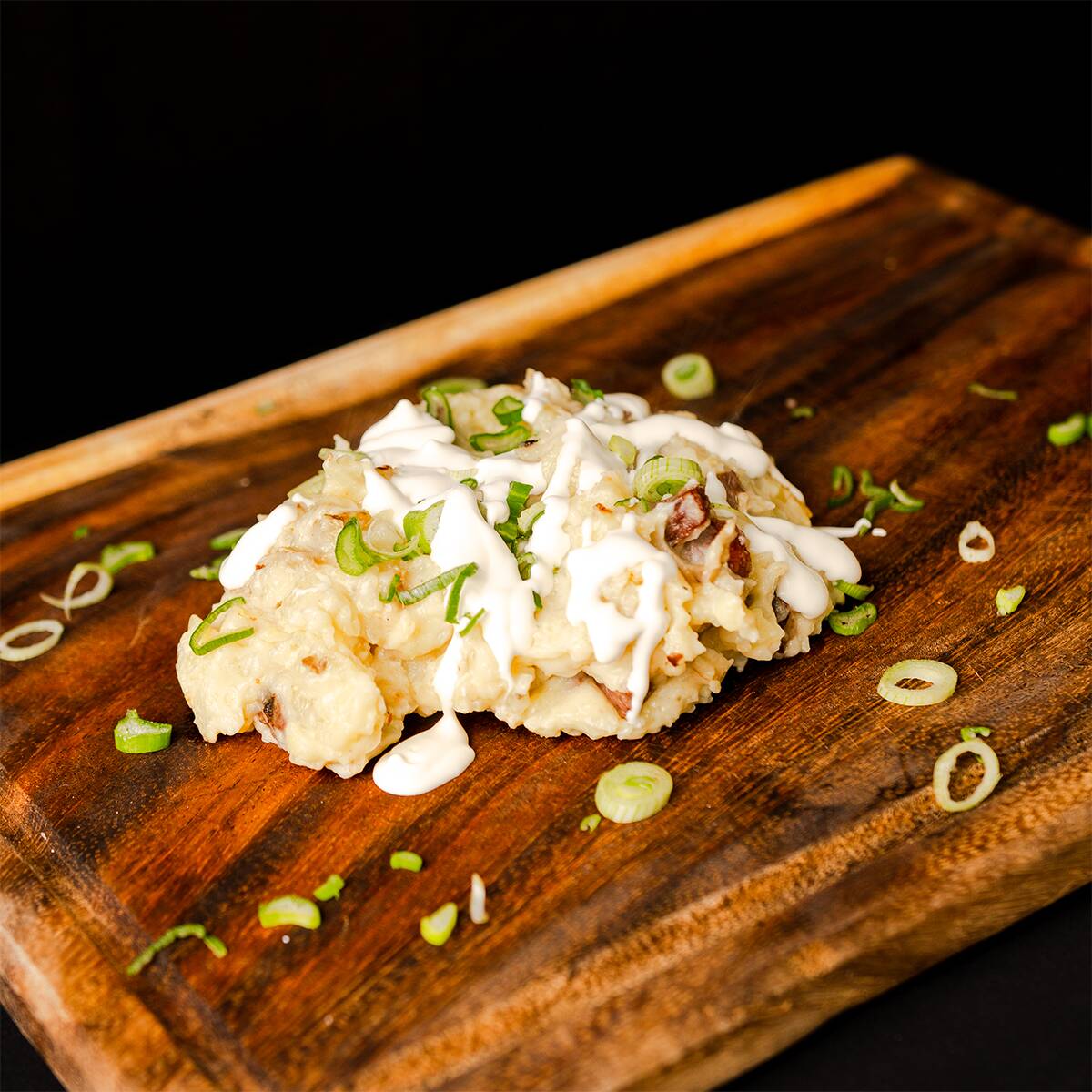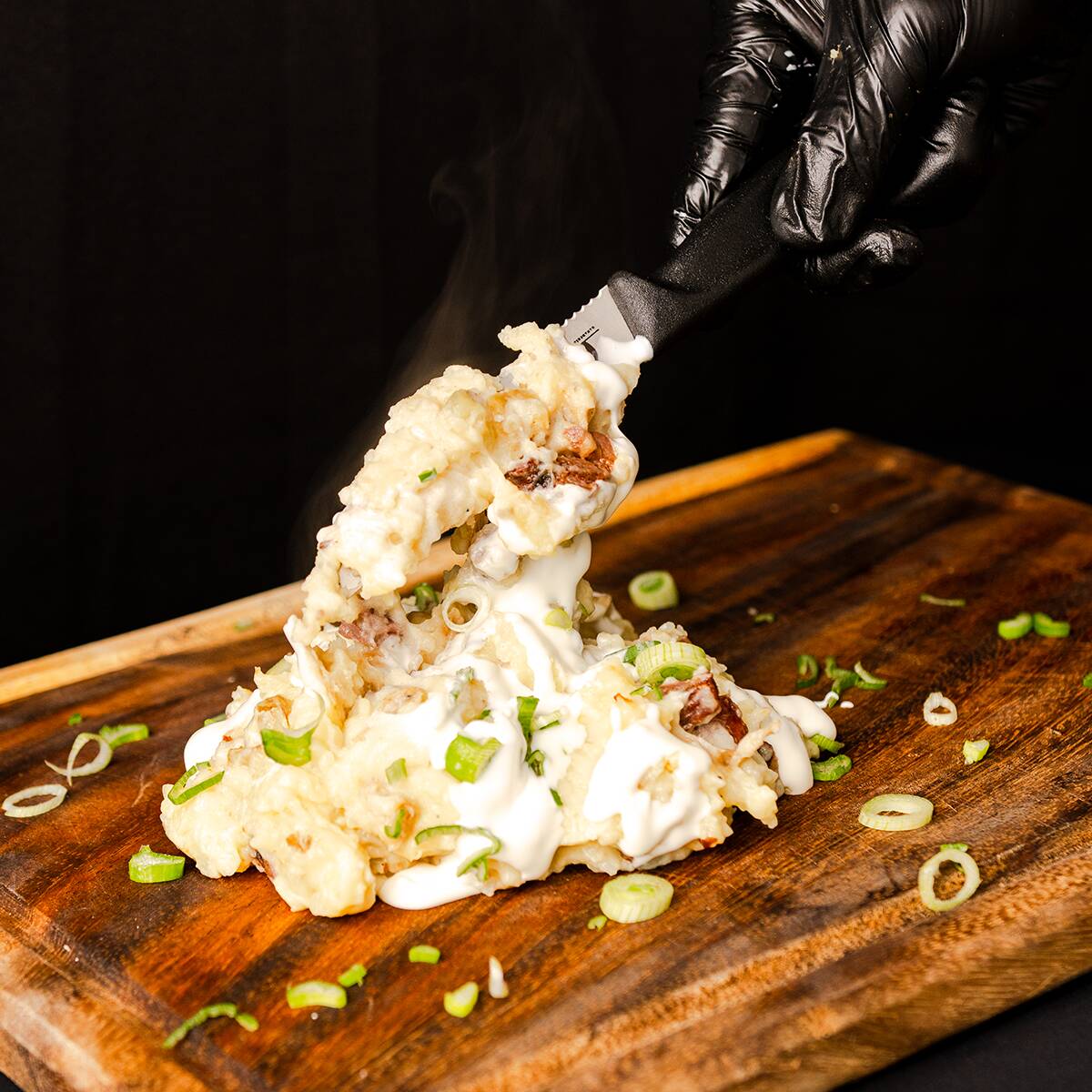Papa rellena de Rib Eye acompañada con crema y queso.