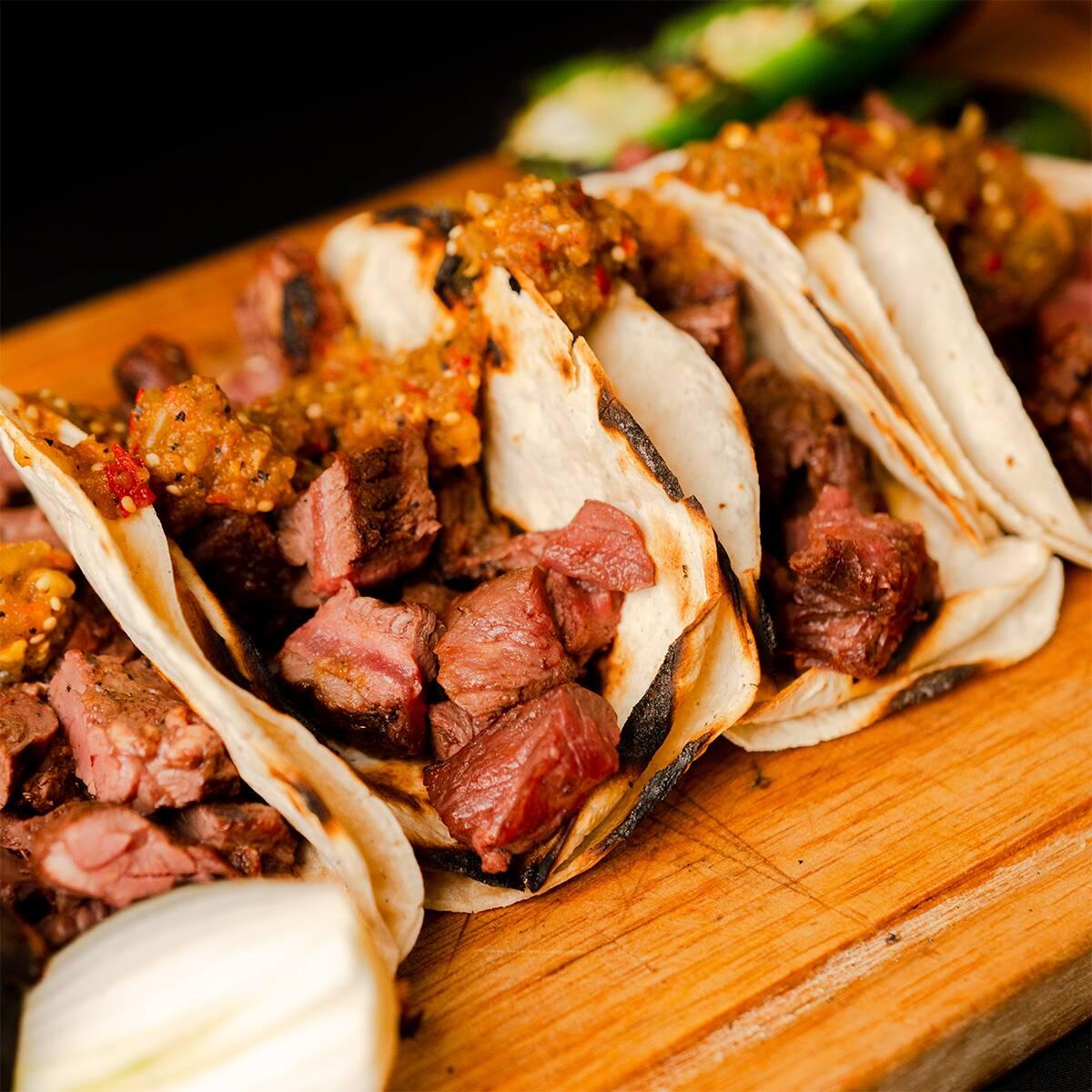 Orden de 4 tacos de Rib Eye, acompañados con salsa, cebolla, chile y nopal..