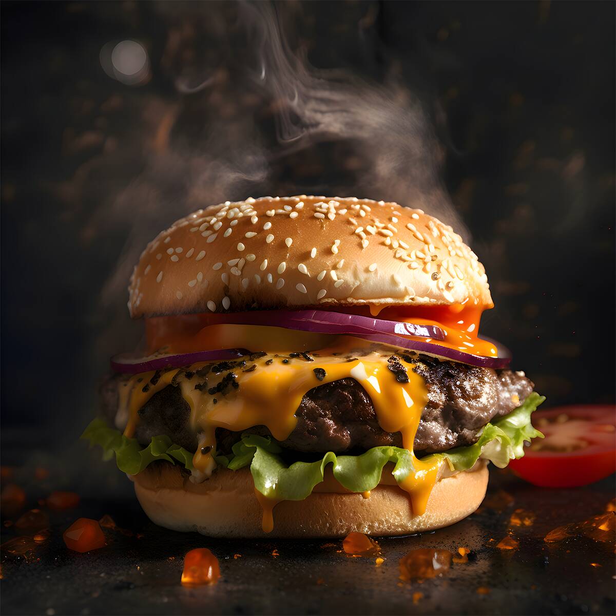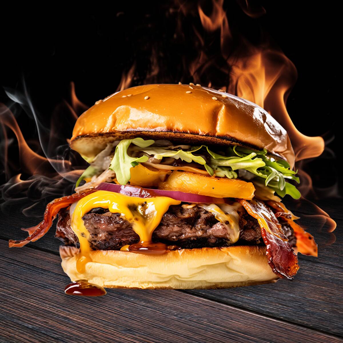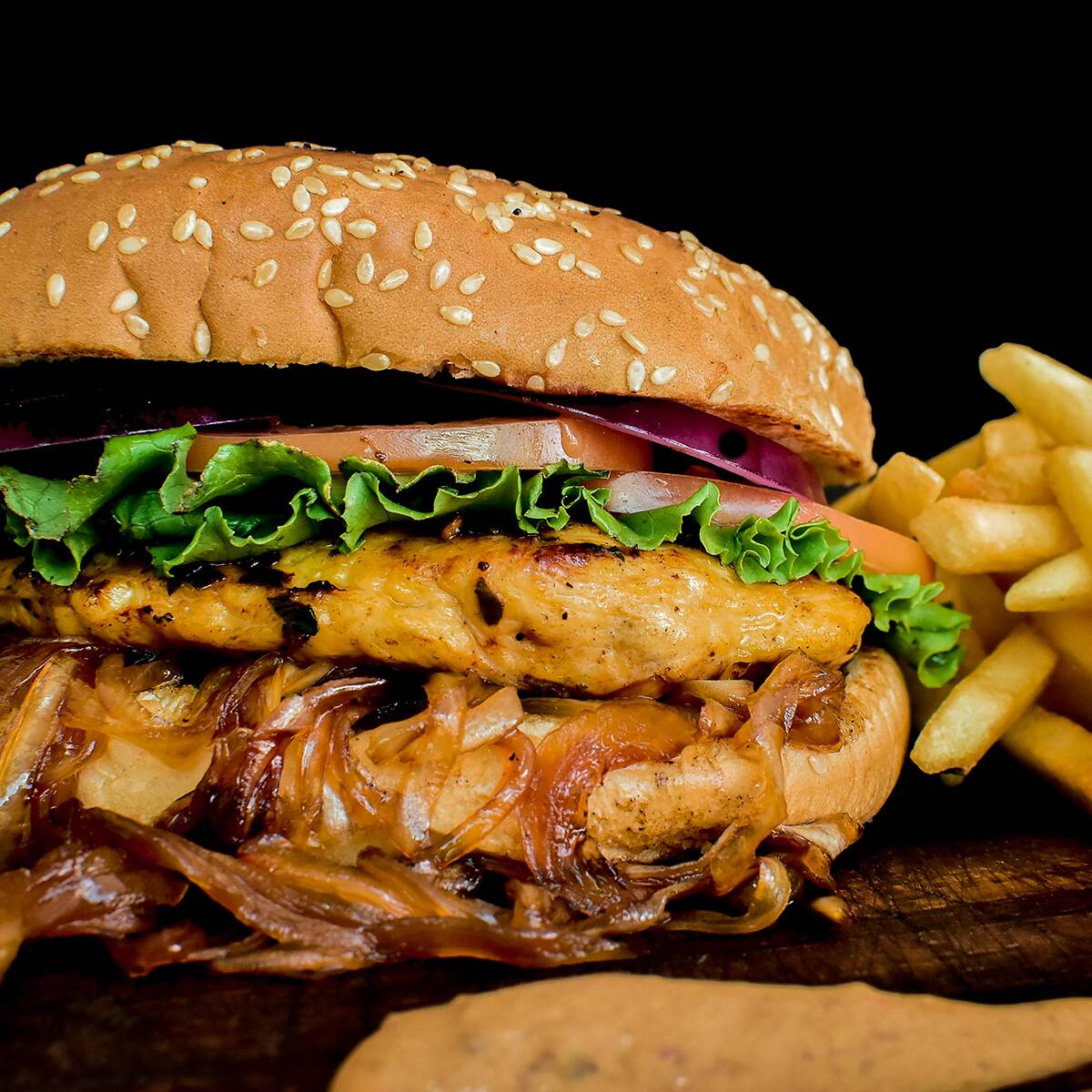 Hamburguesa con Aderezo de Habanero, Carne Premium, Cebolla Caramelizada, Tocino y Queso Chipotle. Viene con orden de papas a la francesa.