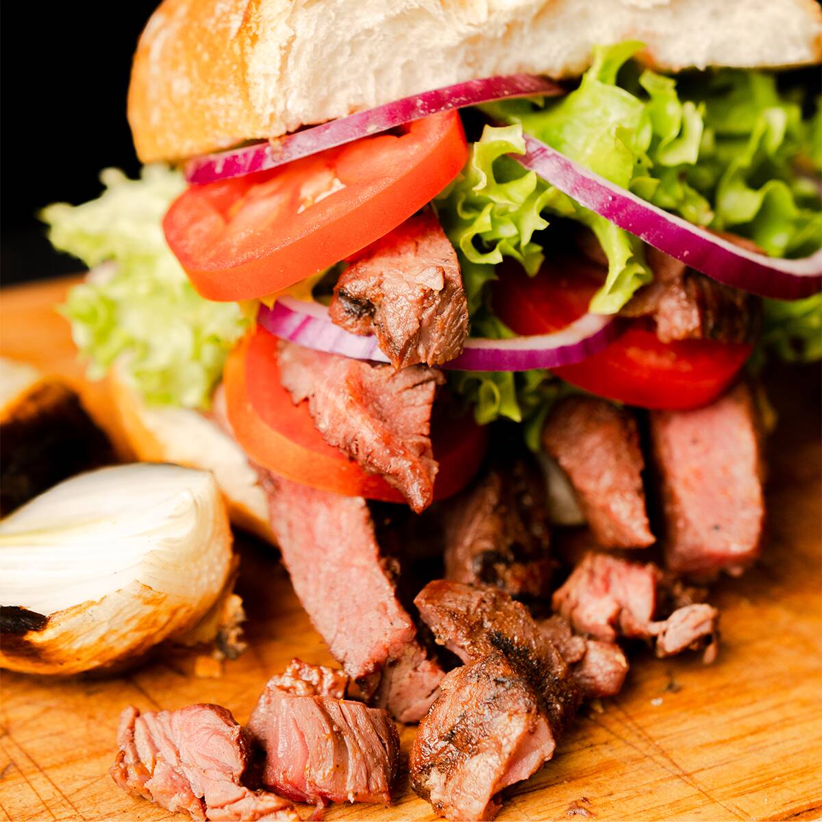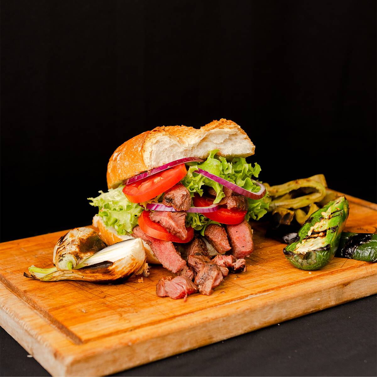 Torta de Rib Eye, acompañada con salsa, cebolla, chile y nopal.
