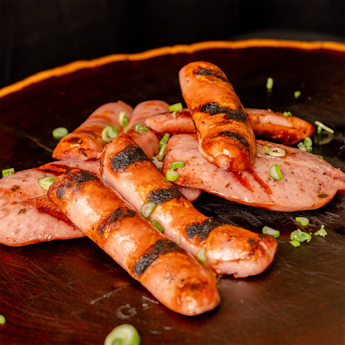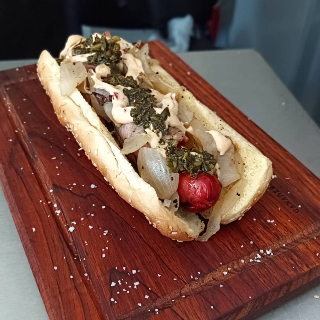 Pan, salchicha p/asar, tocino, cebolla y aderezo.