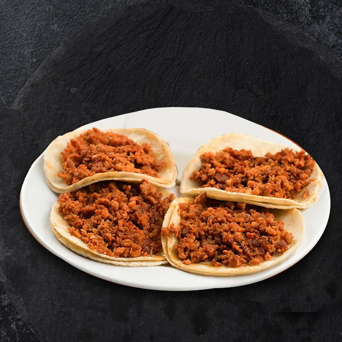 Orden de 4 tacos de Chorizo, acompañados con salsa, cebolla, chile y nopal.