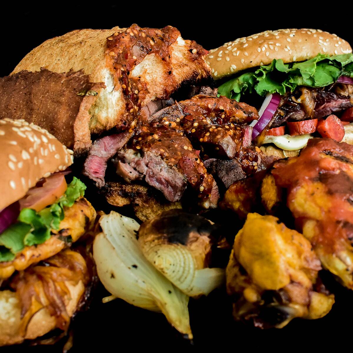 (4 personas). 1 Orden de Alitas. 1 Torta de Arrachera. 1 Hamburguesa Red Angus. 1 Hamburguesa Black Angus.