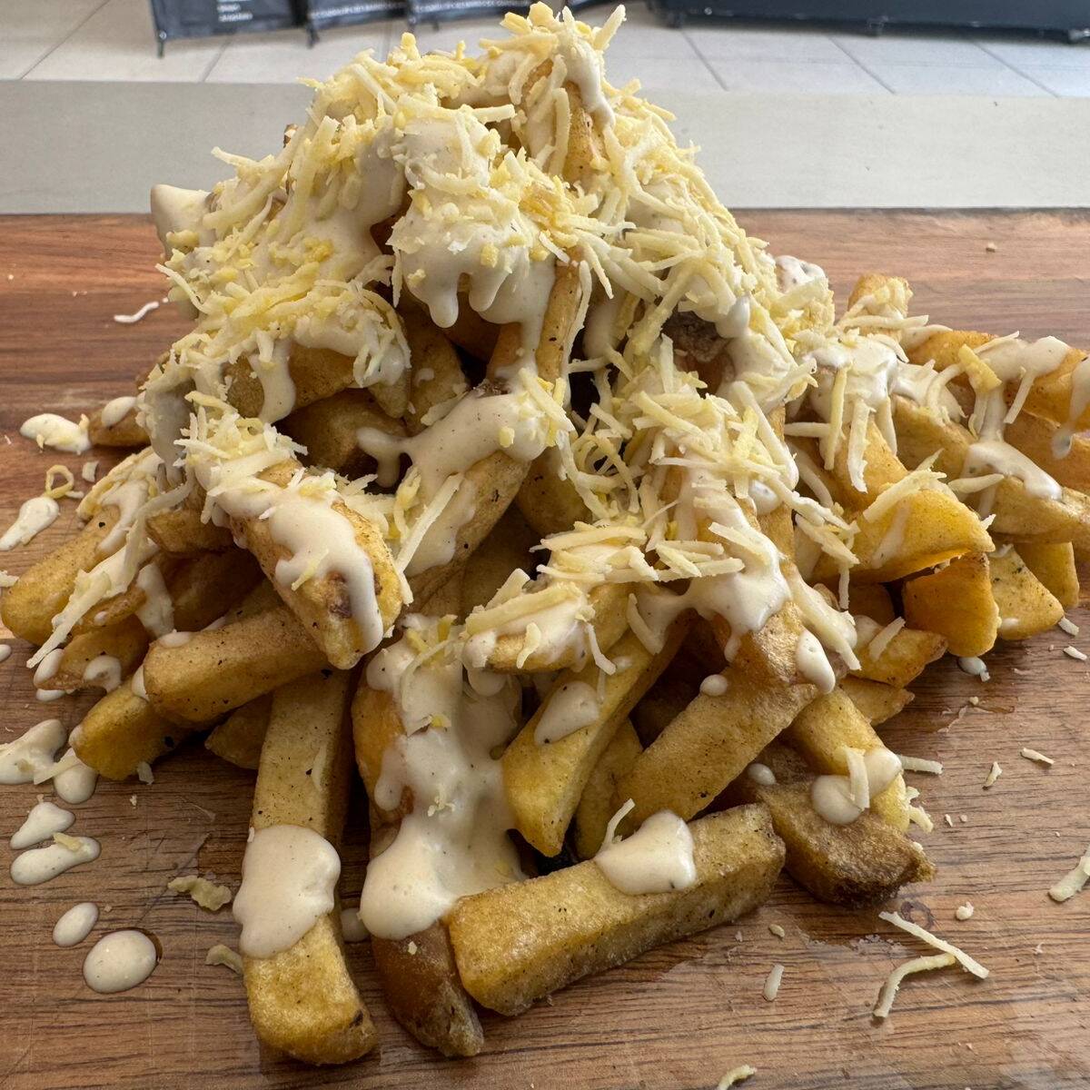Orden de papas a la francesa con crema y mezcla de quesos.
