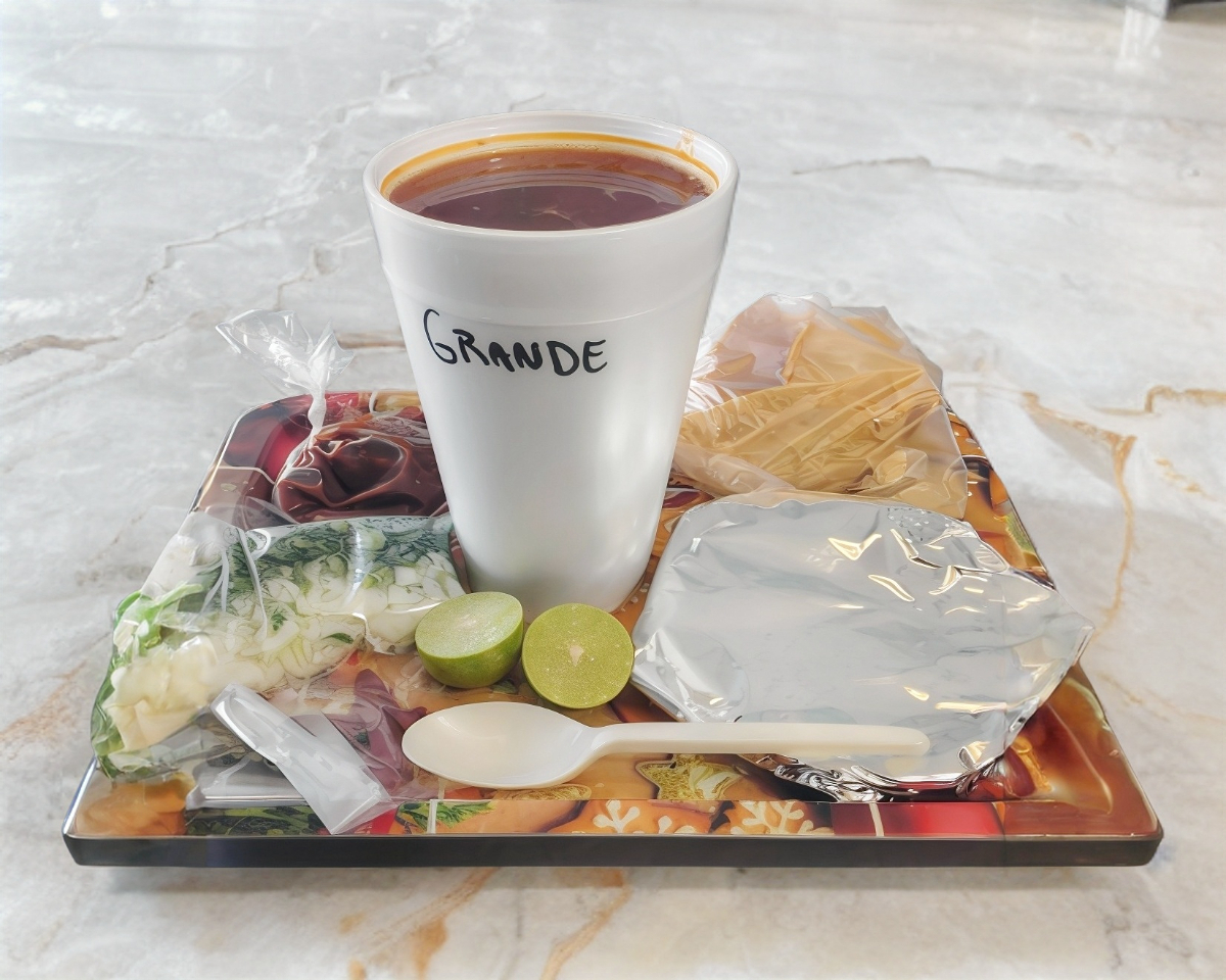 Porción personal en vaso de 16 onzas ingredientes :6 tortillas cebolla silantro totopos limón salsa roja