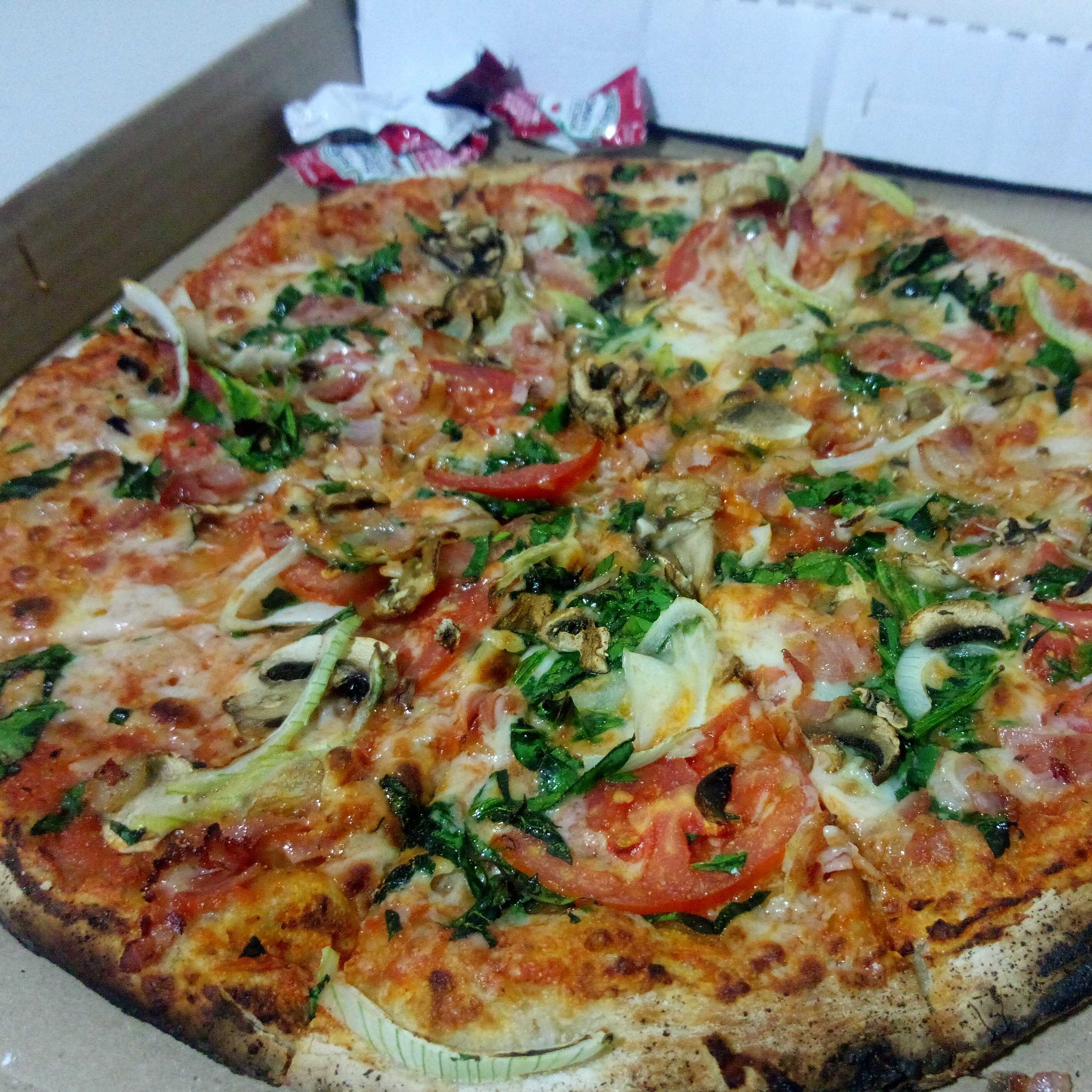 Queso Mozarella, Cebolla, Morron, Espinaca, Jitomate y Champiñones