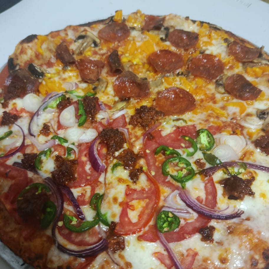Queso Mozarella, Chorizo, Cebolla, jalapeño.