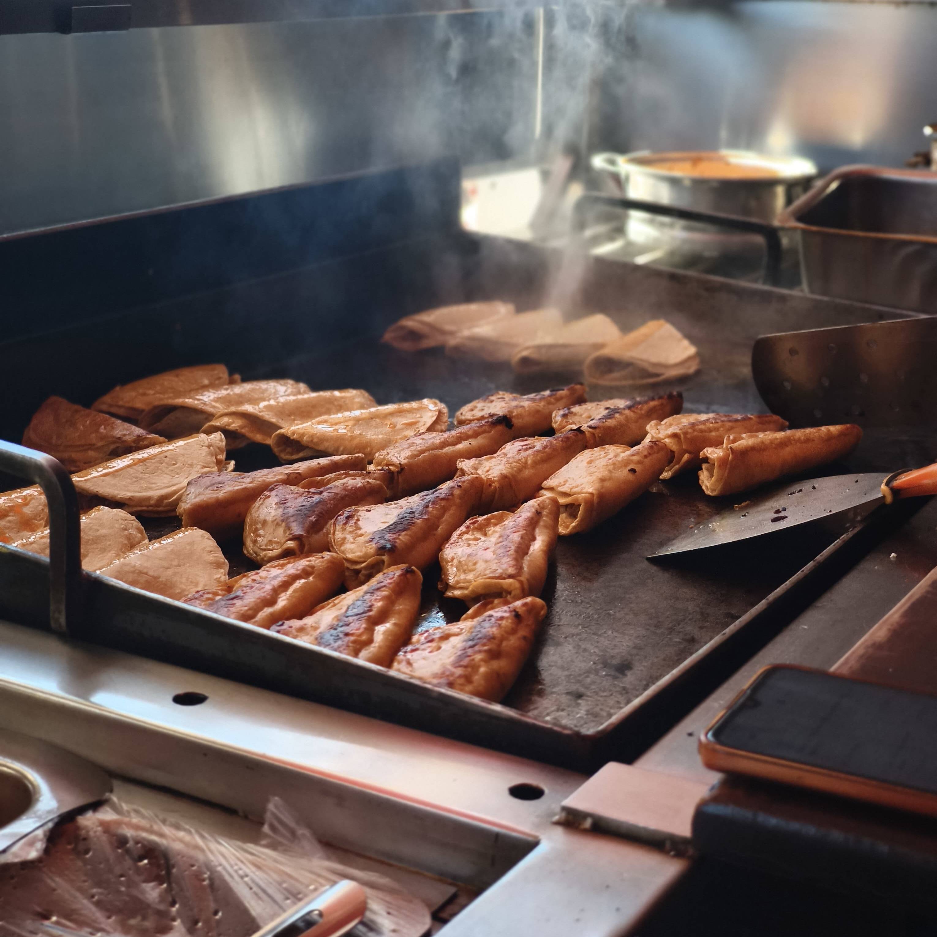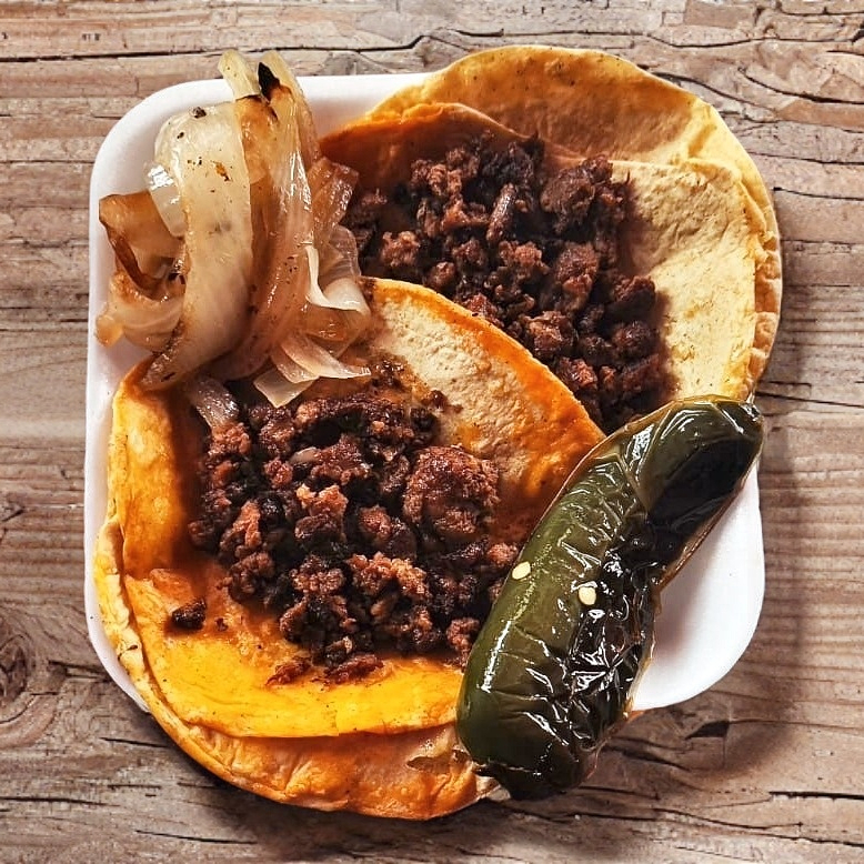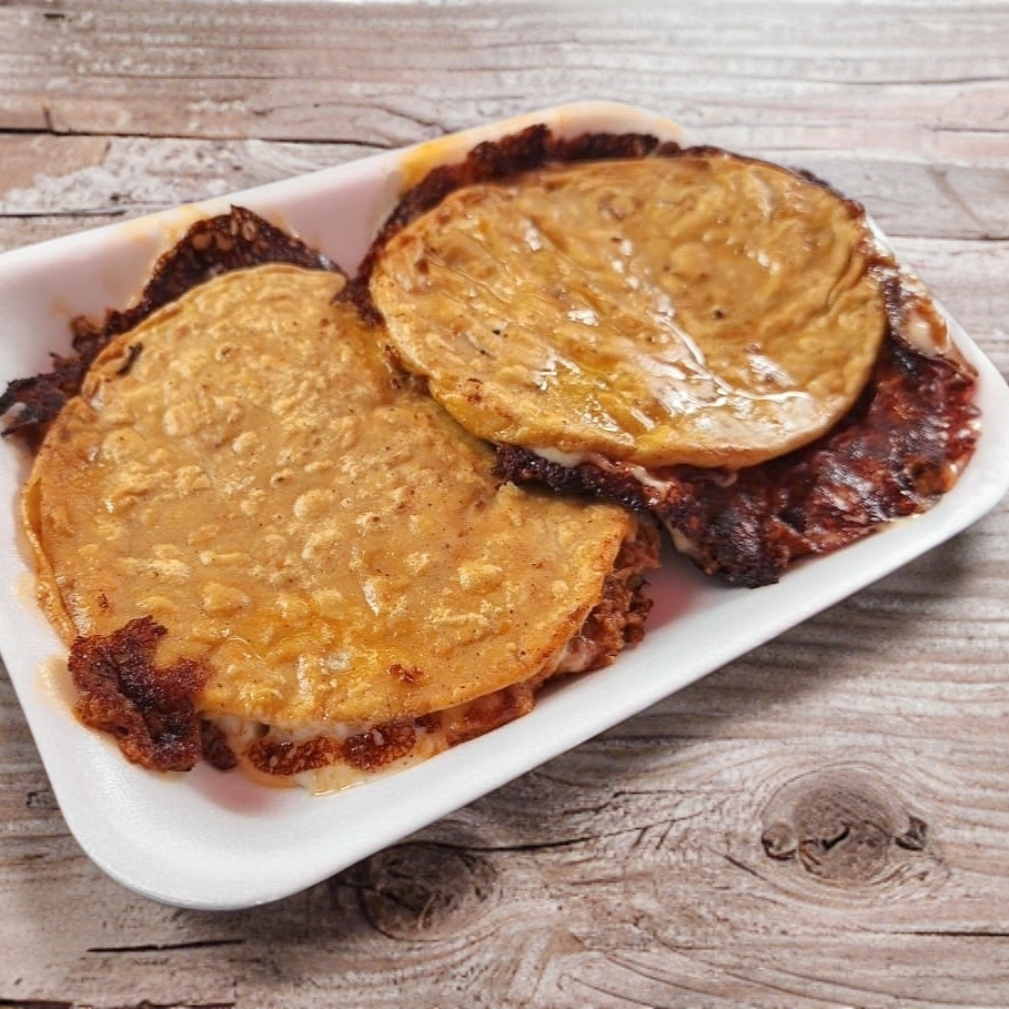 2 Tortillas de maíz con delicioso bistec envuelta con queso gratinado.