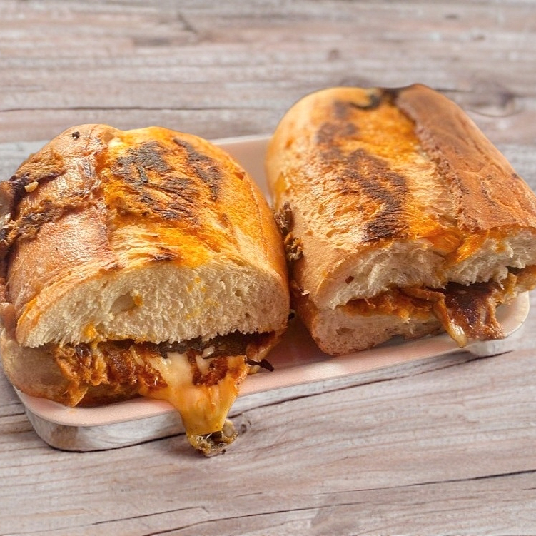 Tradicional bolillo con barbacoa y queso gratinado.