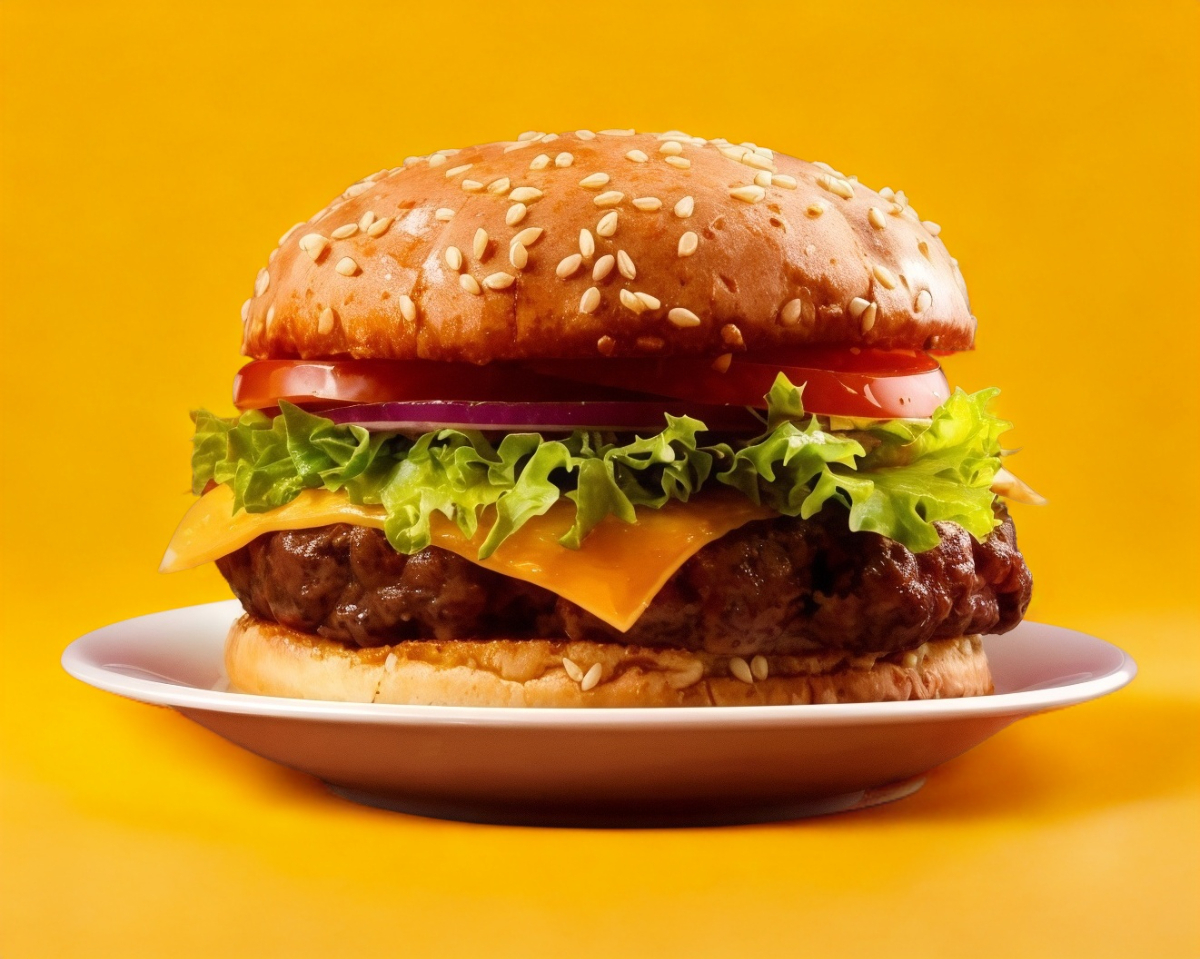 Exquisita Hamburguesa con tocino, jamón, queso amarillo, aguacate, jitomate, cebolla, aderezos.