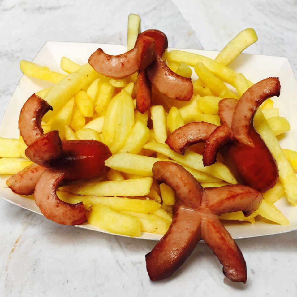 Orden de salchichas y papas fritas, acompañadas de aderezo de tu elección