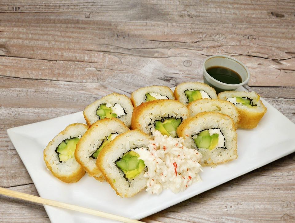 Relleno: pepino, aguacate, queso crema. Cubierta: empanizado y tampico.