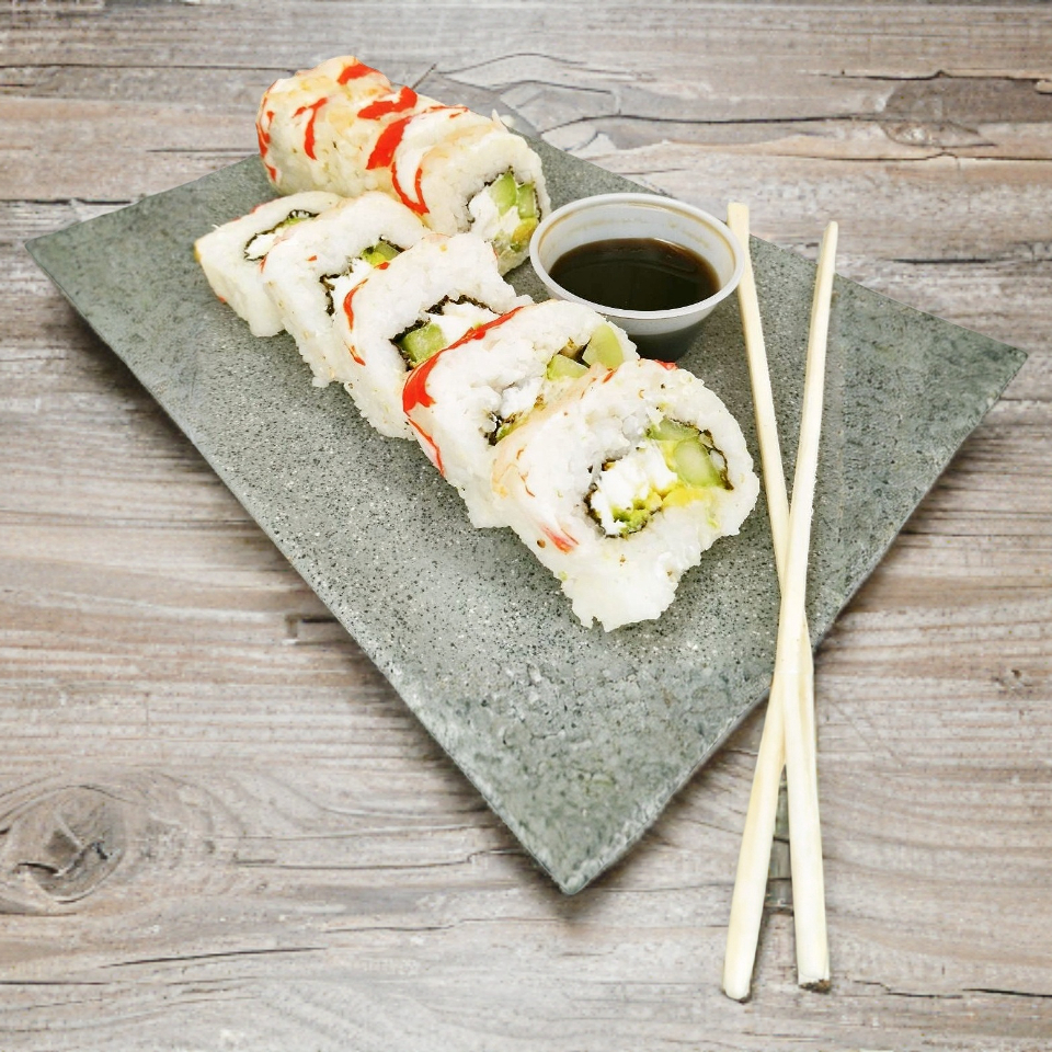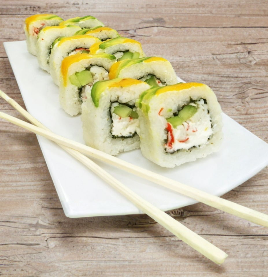 Relleno: pepino, surimi y queso crema. Cubierto: aguacate (mango fuera de temporada).