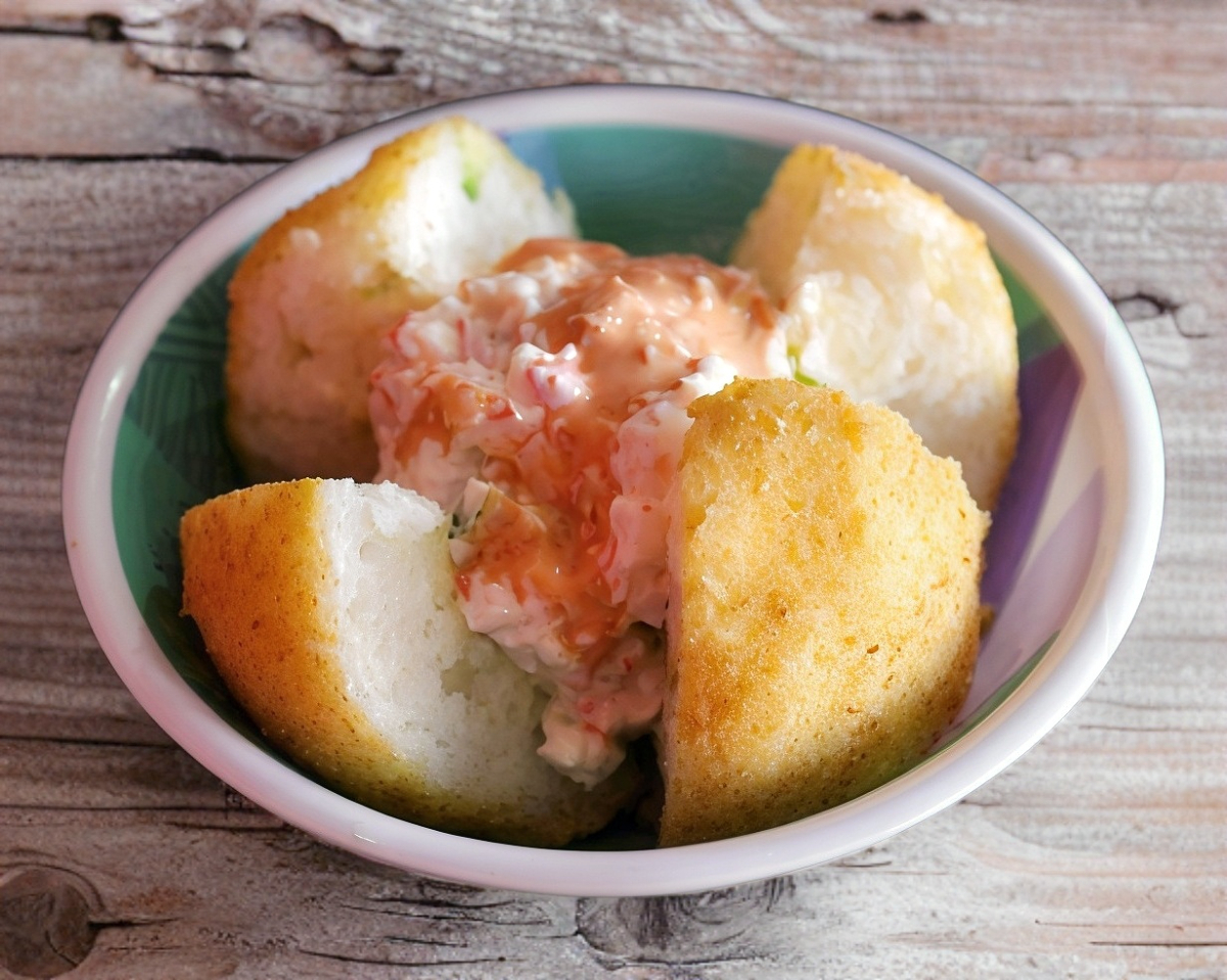 Brocheta empanizada de surimi con queso crema acompañada de aderezo chipotle.