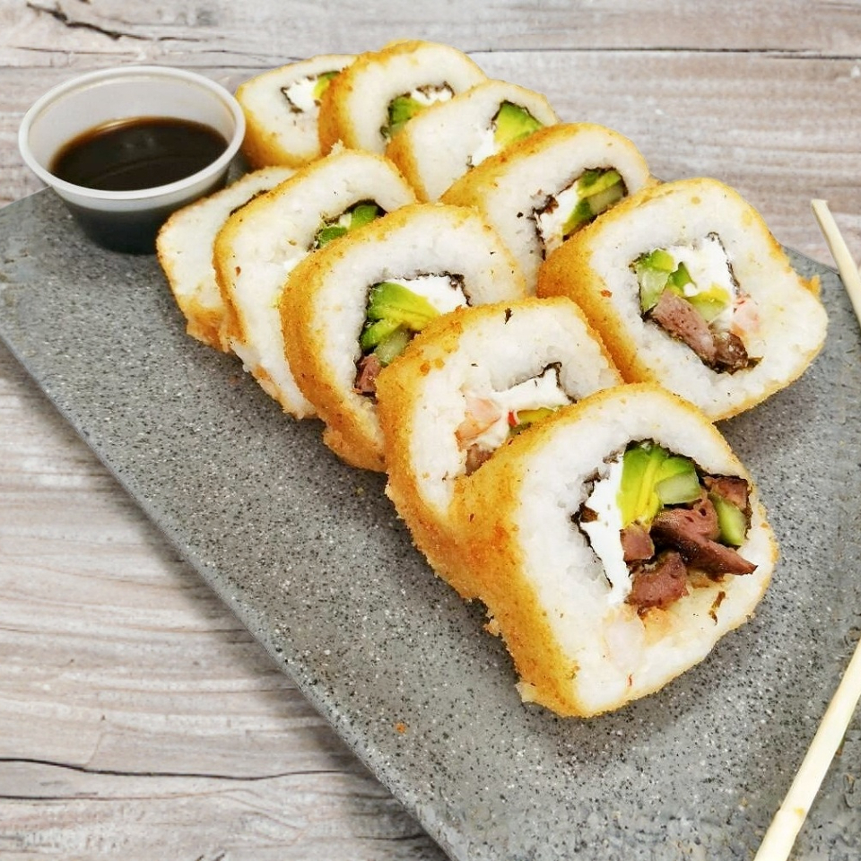 Relleno: pepino, aguacate, queso crema, filete de res y camarón. Cubierto: empanizado.