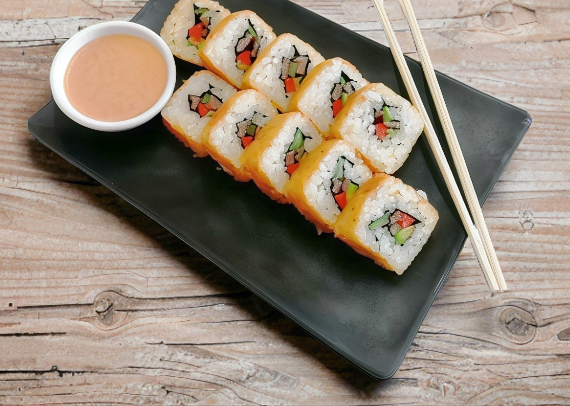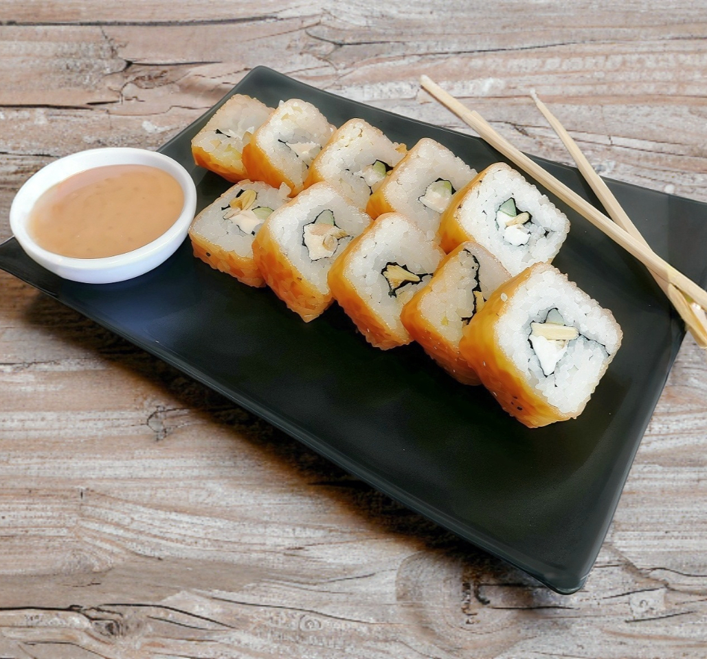 Exquisito rollo empanizado, relleno de pollo, queso crema y pepino, acompañado de un dip de chipotle