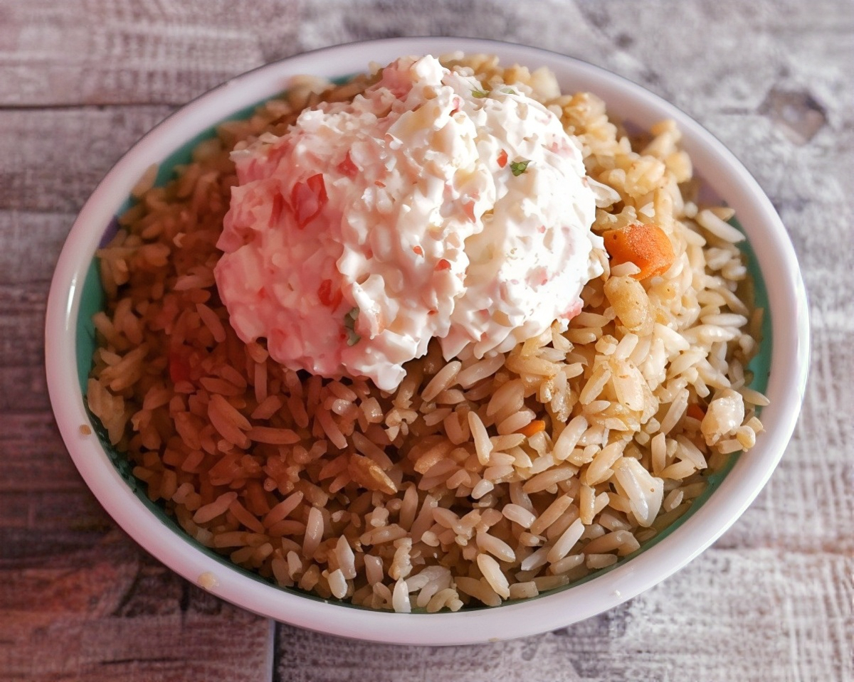 Arroz frito con verduras, sazonado con soya y con una porción de tampico.