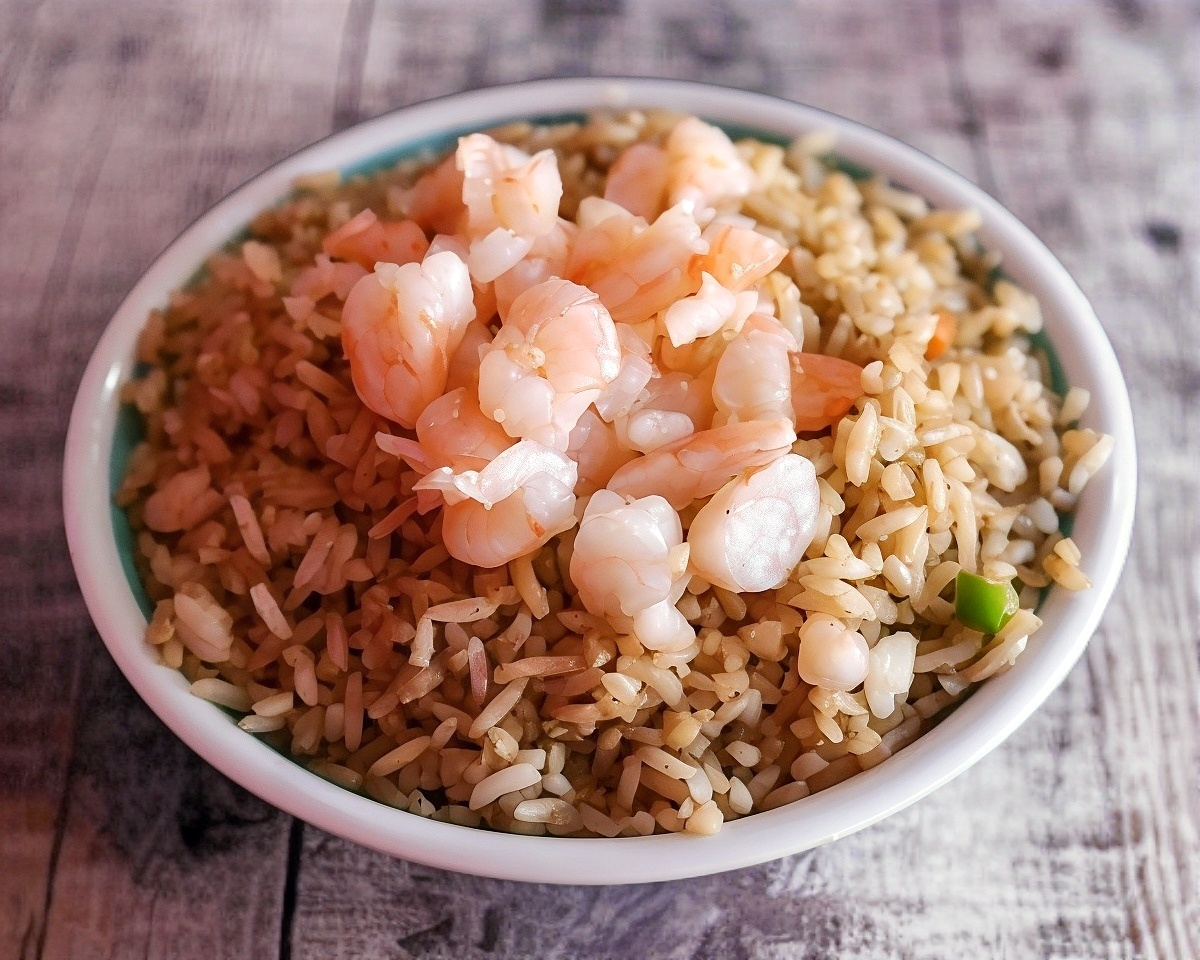 Arroz frito con verduras, sazonado con soya y con una porción de camarón.