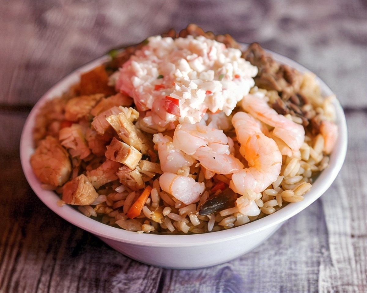 Arroz frito con verduras, sazonado con soya y con una porción de filete de res, pollo, camarón y tampico.