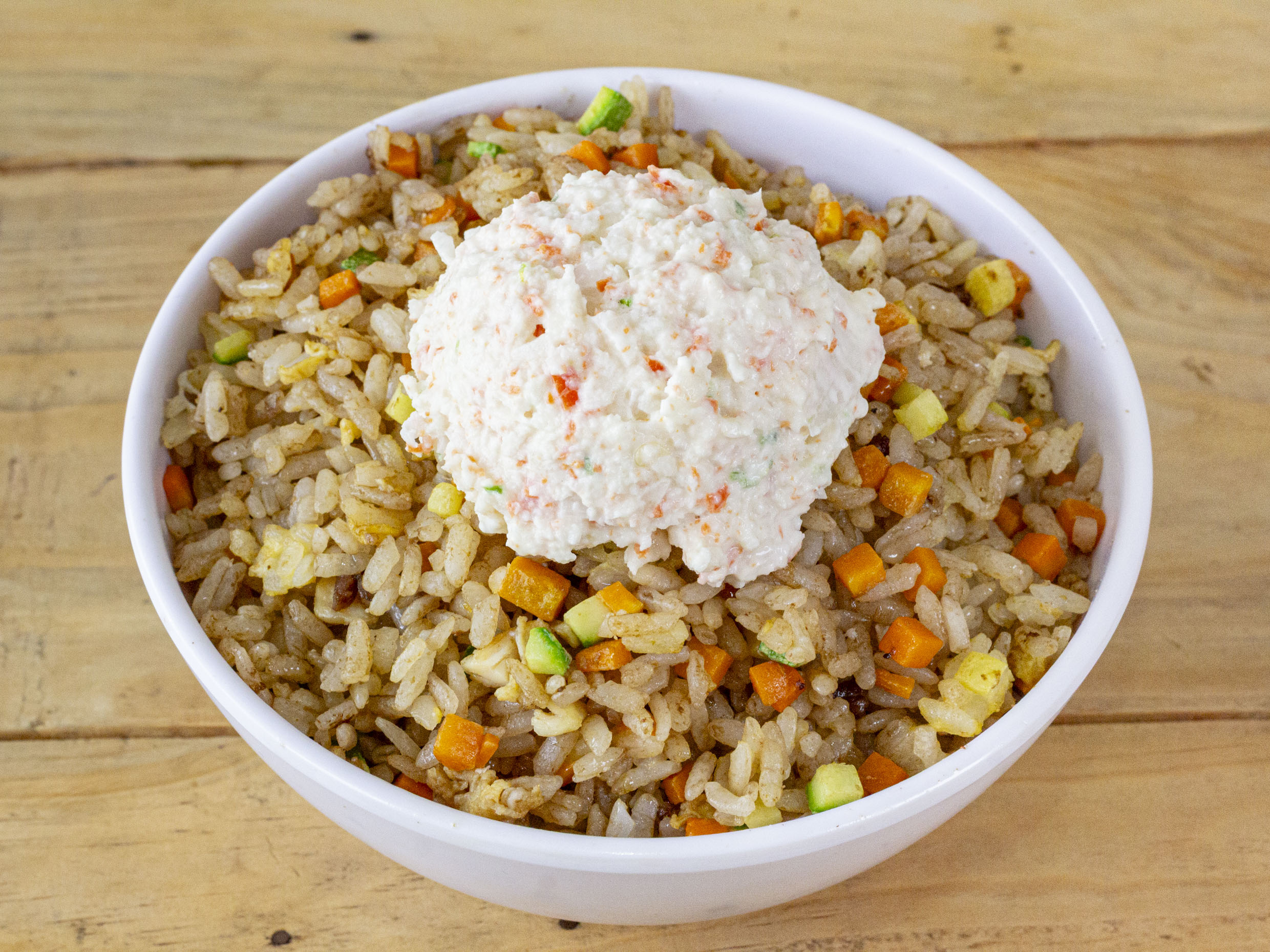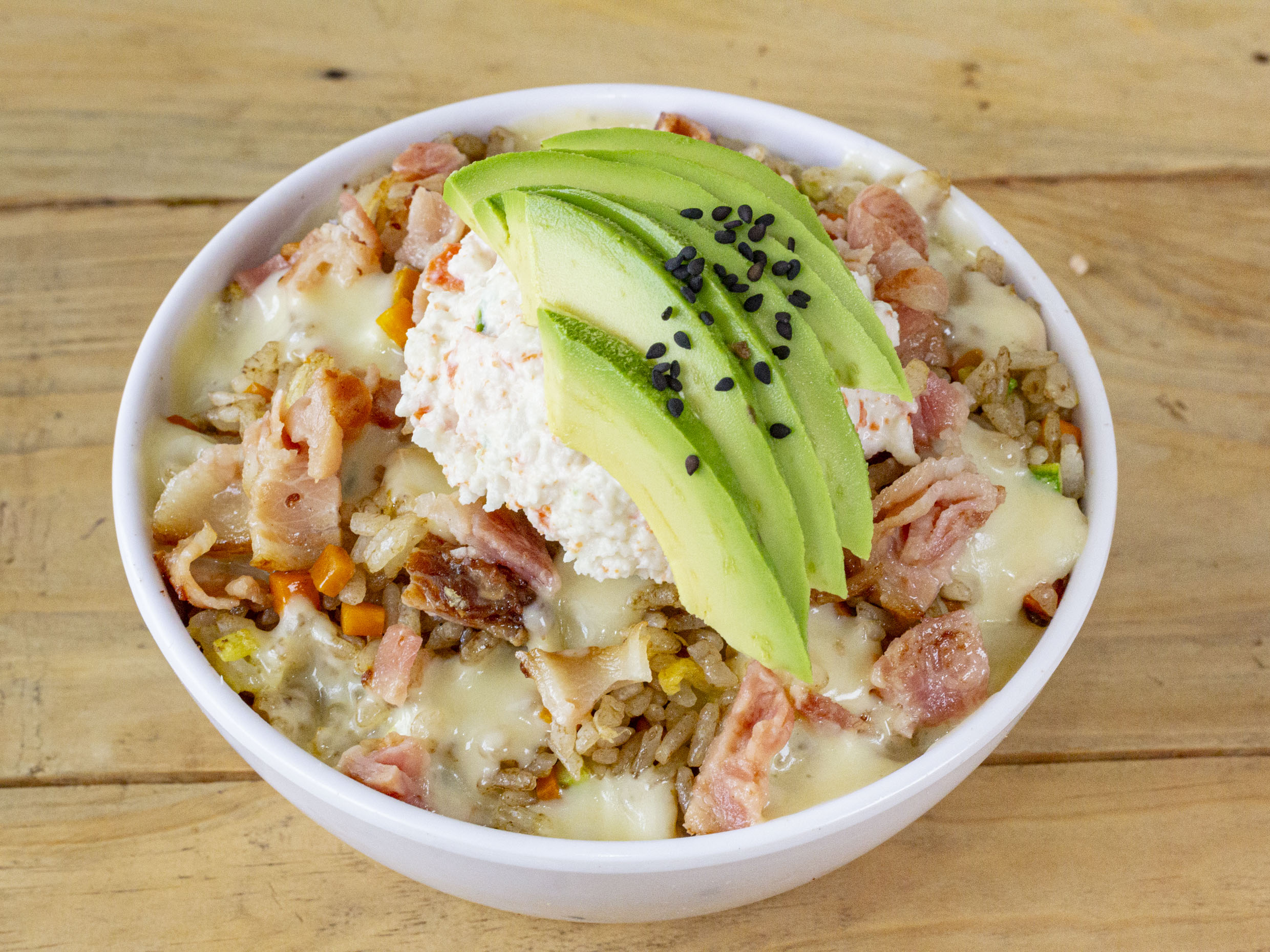 Arroz frito con verduras, huevo y salsa de soya. Tocino, queso Gouda, aguacate y Tampico